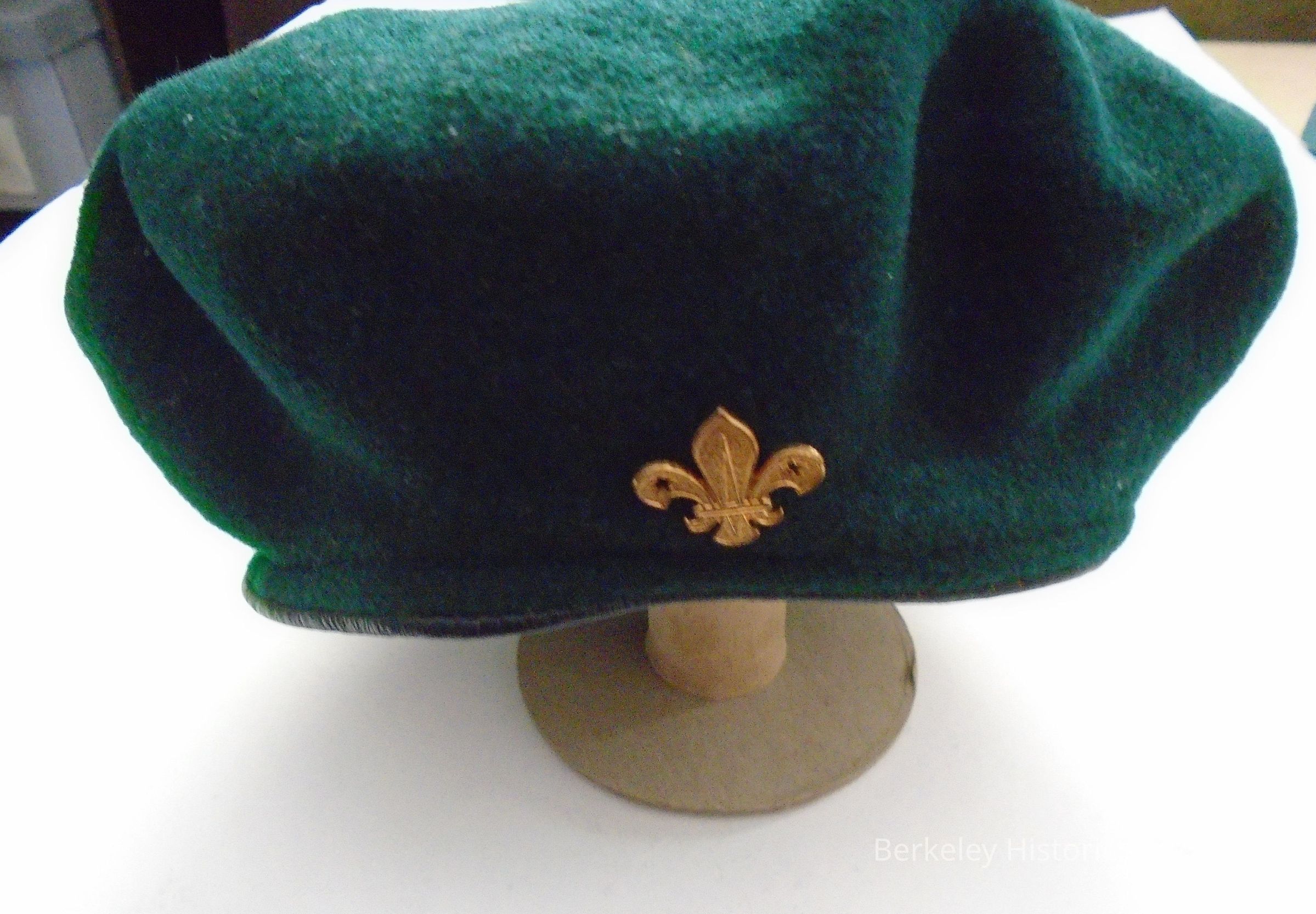 Dark green wool Junior Girl Scout beret with Girl Scout pin in front.