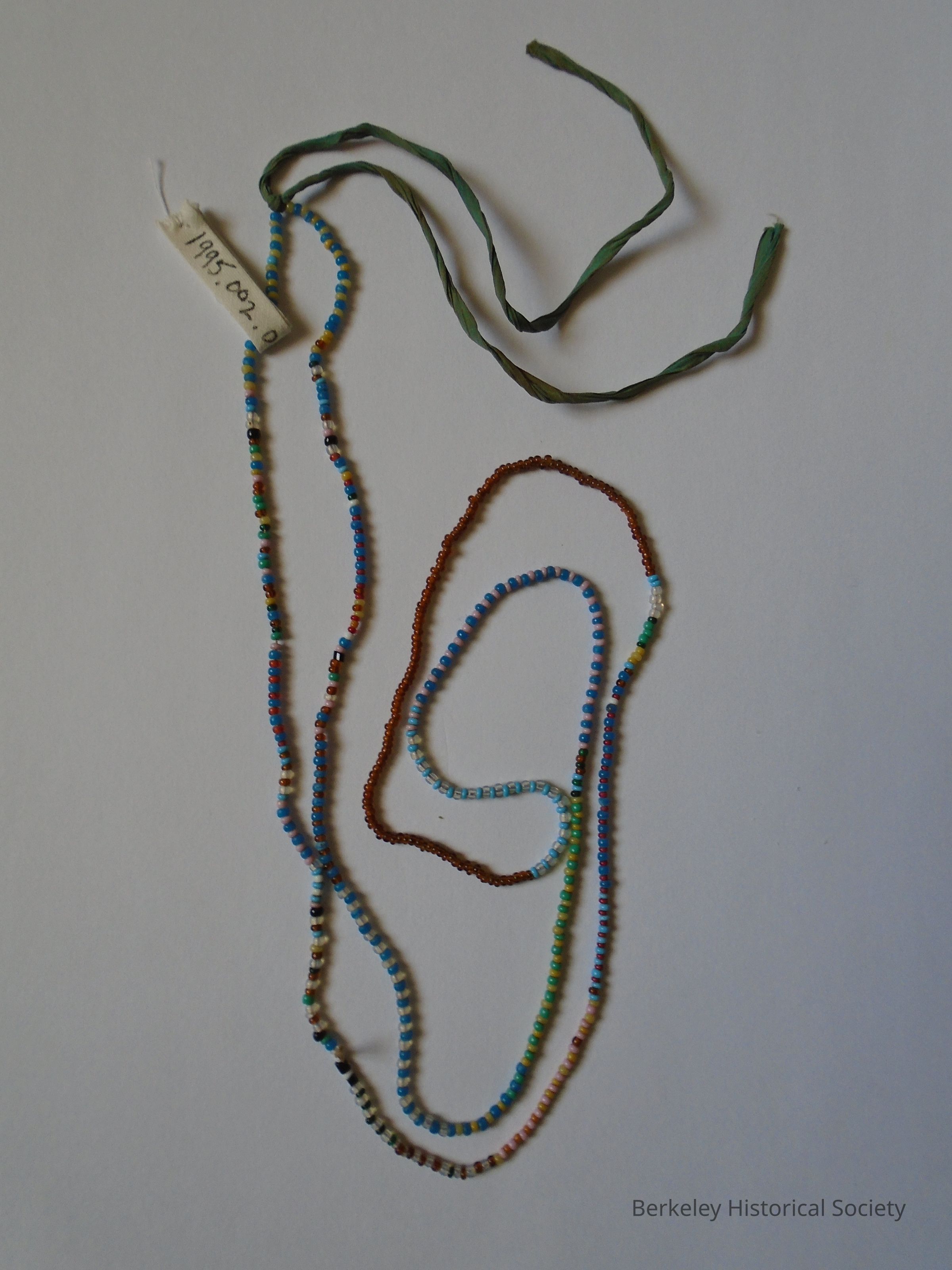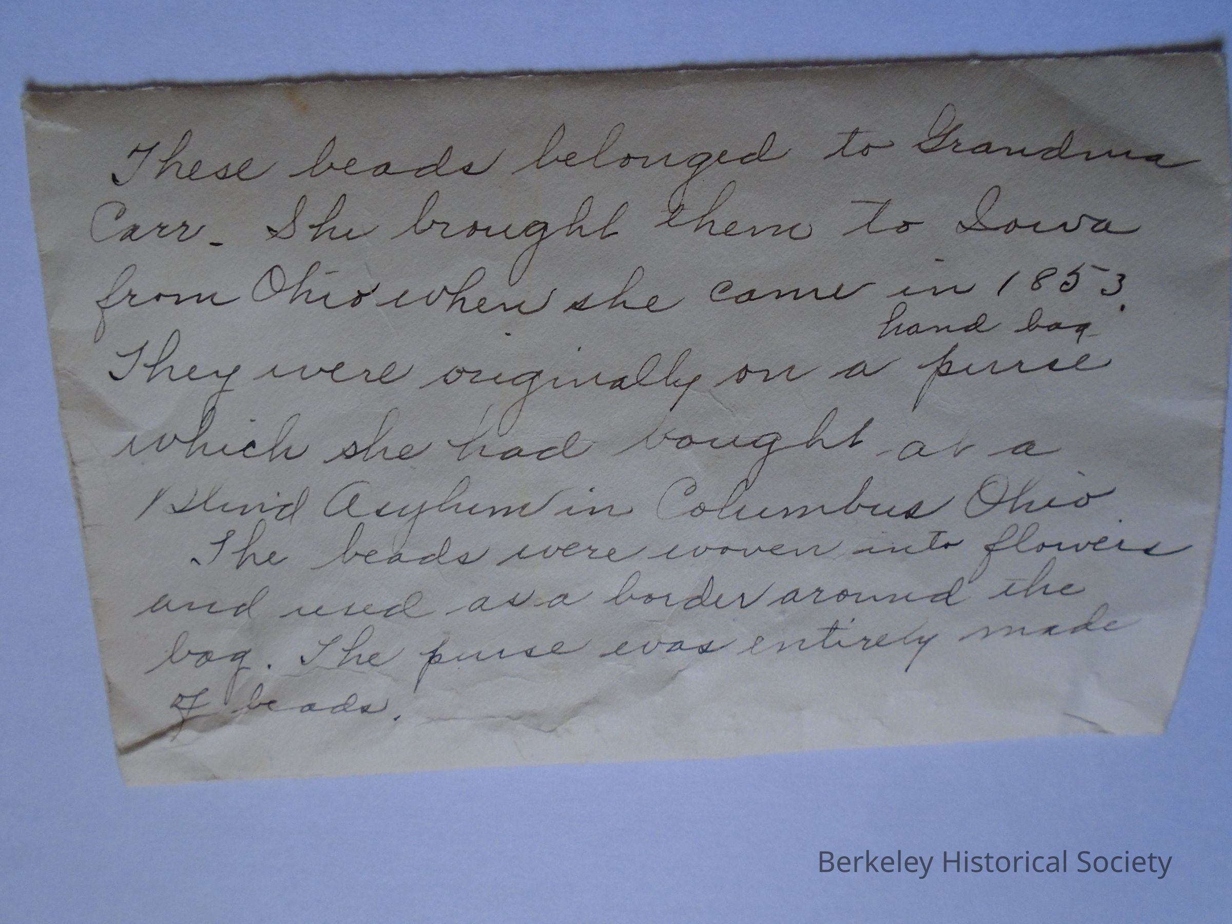 Tiny, colored glass beads strung on a thread and with a piece of cloth twine tied to it, like a necklace. Beads were originally sewn on a purse. Beads are in an envelope with a handwritten note on the outside: "These beads belonged to Grandma Carr. She brought them to Iowa from Ohio when she came in 1853. They were originally on a purse which she had bought at a Blind Asylum in Columbus Ohio. The beads were woven into flowers and used as a border around the bag. The purse was entirely made of beads." Blues, white, amber.