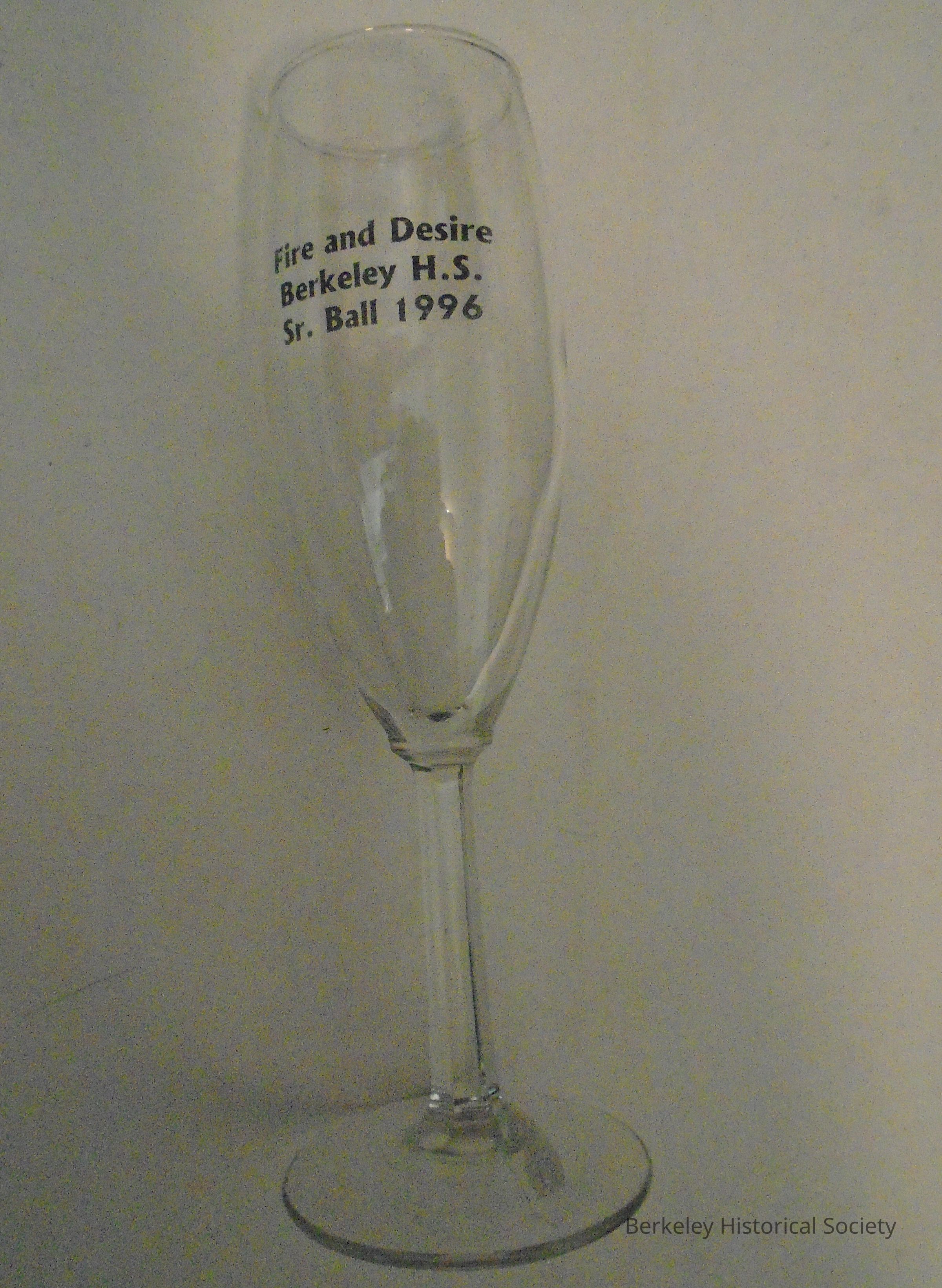 Champagne glass (glass) with inscription in black: Fire and Desire, Berkeley H.S. Sr. Ball 1996. High School Ball.