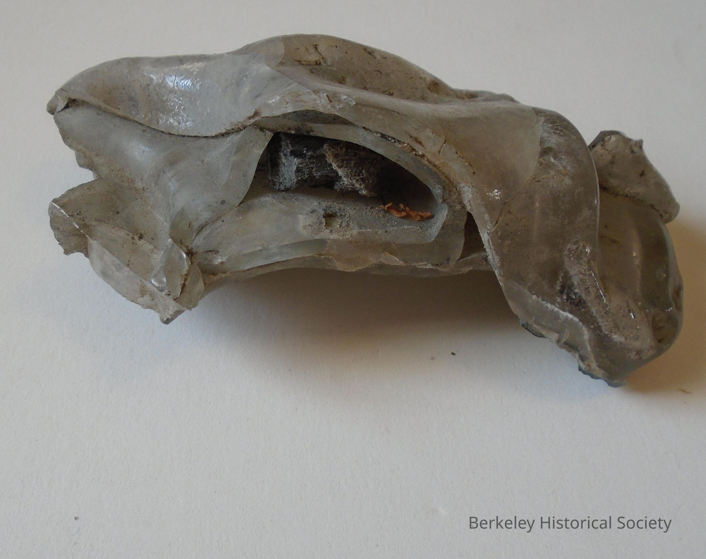 Piece of glass, melted in the Berkeley Fire of 1923. Four or five layers of glass sheets, curled around a piece of wood ash. Covered with dirt, as if buried.Lexicon