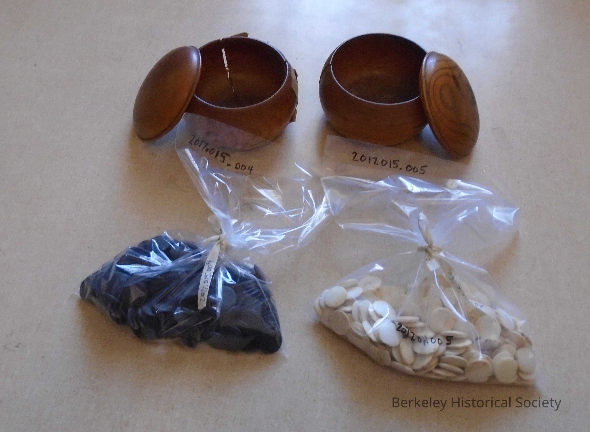 Many black stone discs, playing pieces for Go game. See also 2017.015.001-2017.015.005 for board and bowls. The game pieces/stones were used in a Japanese internment camp during WWII and later after the war by evacuees who temporarily stayed at a house at 1813 University Ave. in Berkeley.
