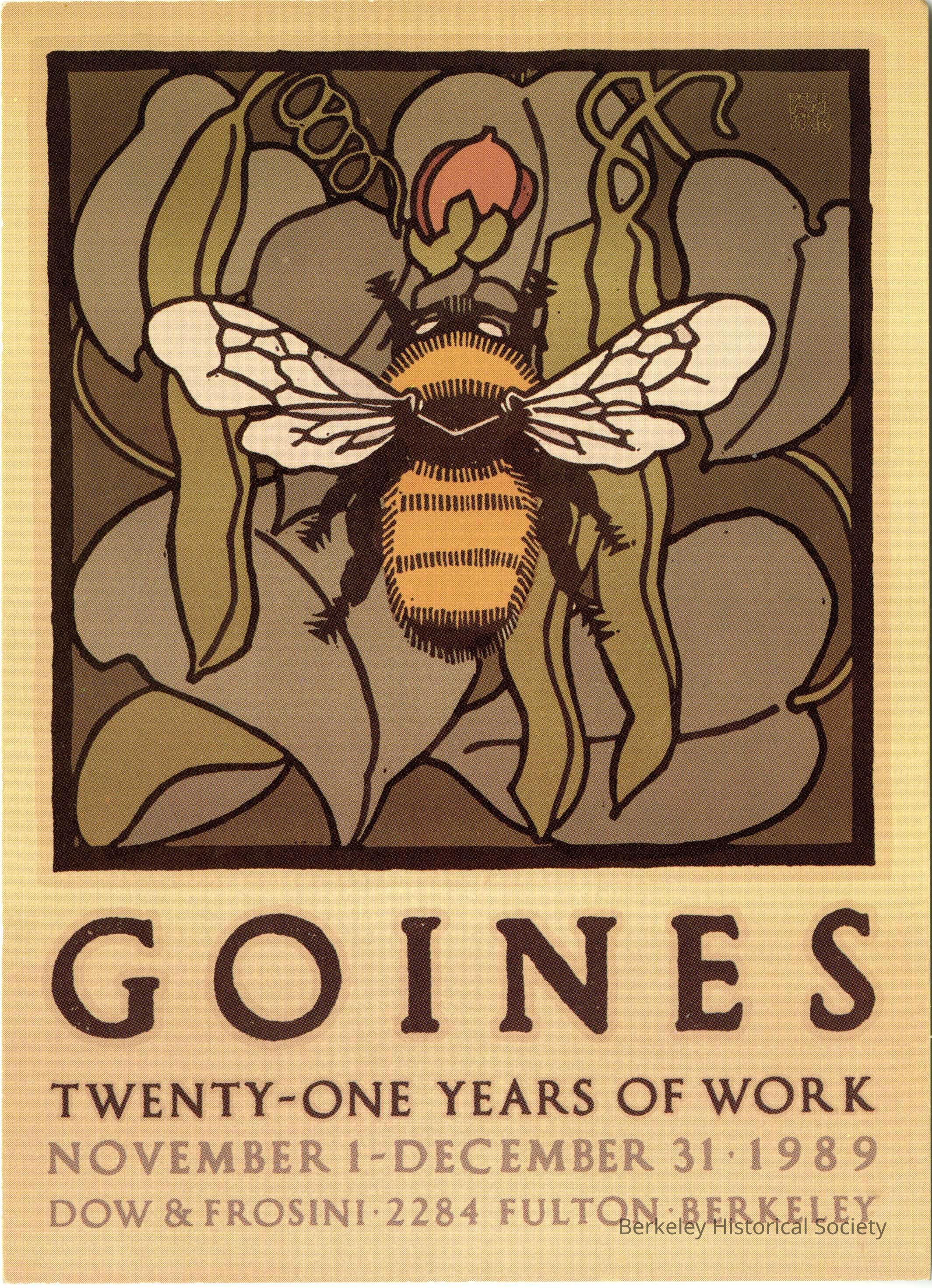 Postcard advertising a 1989 exibition of the work of David Lance Goines at the Dow & Frosini Art Gallery/Custom Framing shop. 2284 Fulton Street.