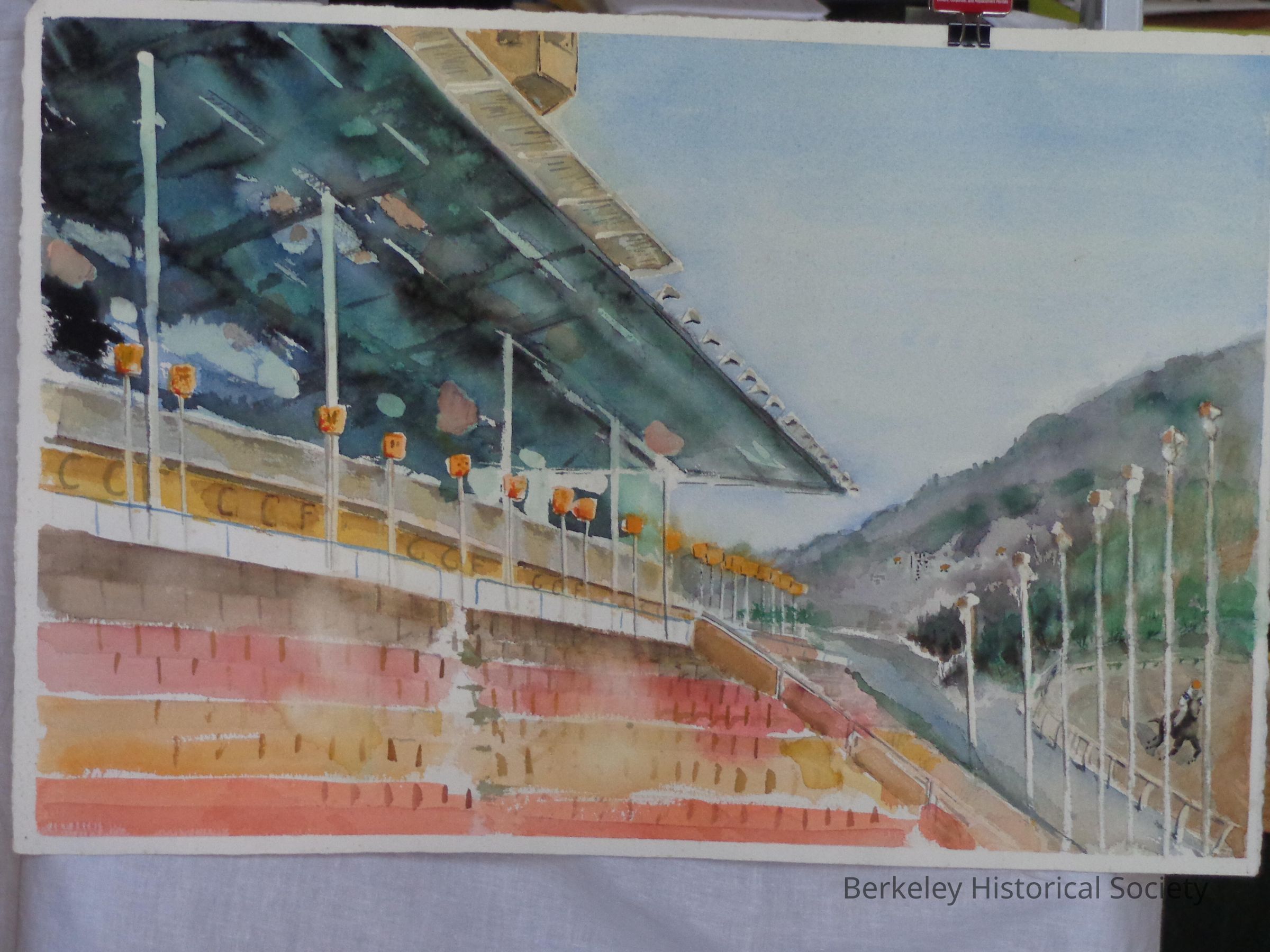 View of stands to the left, racetrack to the right. Untitled, undated, unsigned.Made/Created