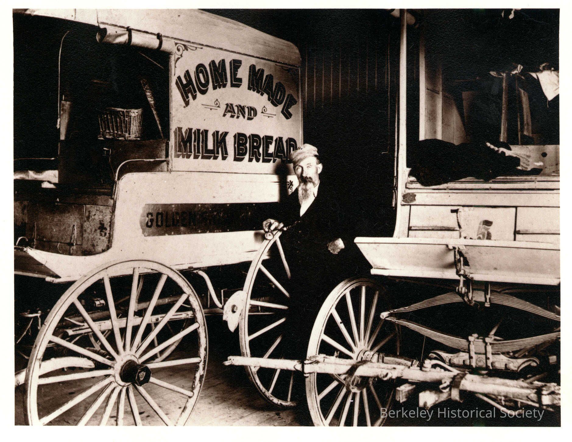 Man between two Golden Sheaf Bakery wagons. 2069-71 Addison Street.