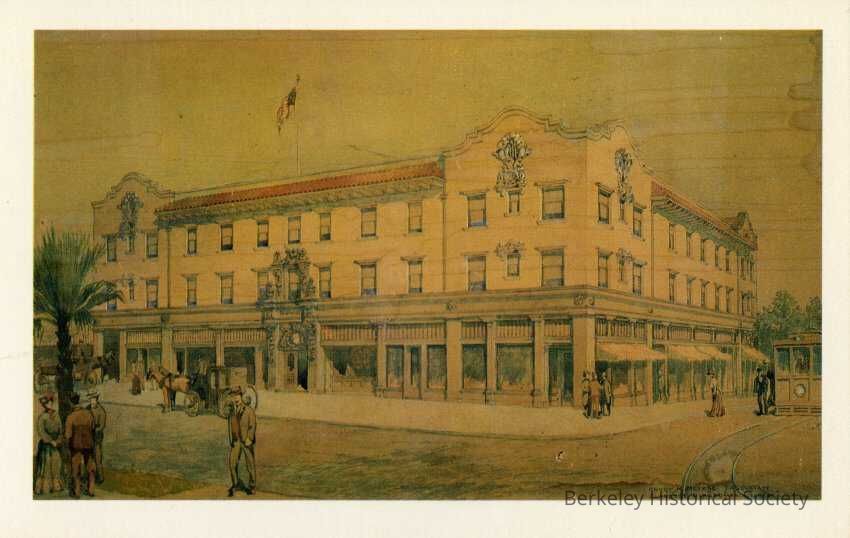 Description on Postcards: The Granada building, facing the University of California at Bancroft and Telegraph in Berkeley, was designed in 1905 by Meyers & Ward of San Francisco. Still in the family of the original owners, the Granada's Mission Revival style (lost to building codes in the 1950s) is now being restored.