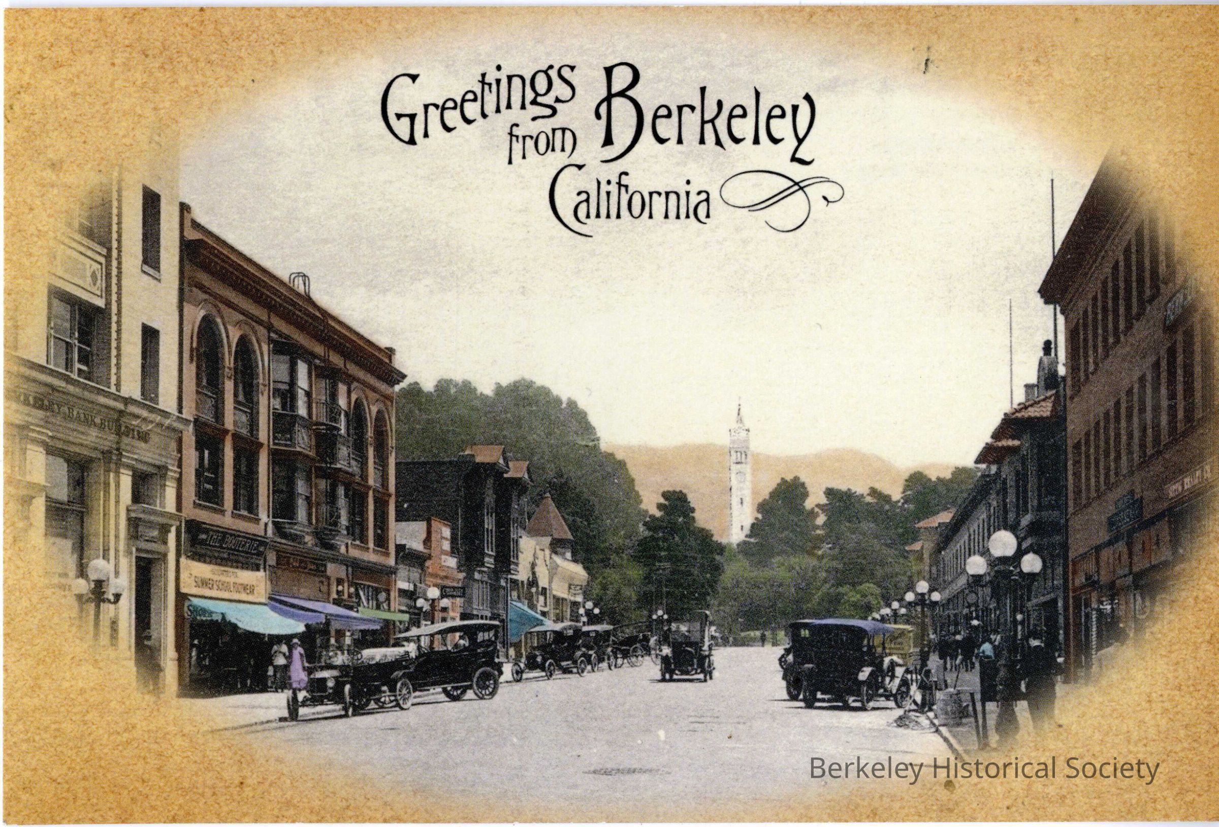 Description printed on verso: Center Street, Berkeley, California, looking towards the University of California campus and Sather Tower. Original postcard published by the Albertype Co., c. 1915. From the collection of Sarah Wikander. "Hand-colored" by Kathleen Tandy Design.