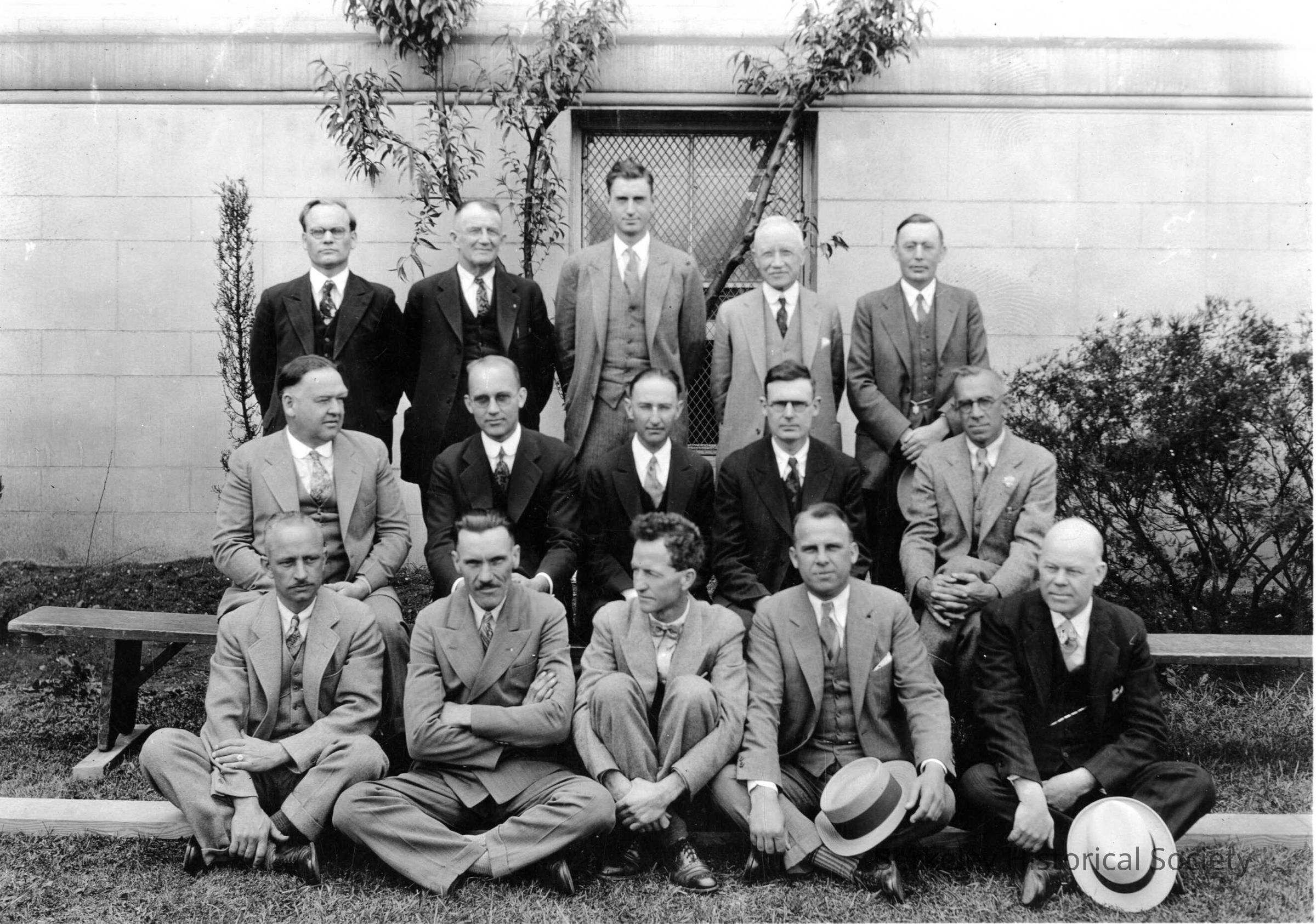 Group of men in front of large building