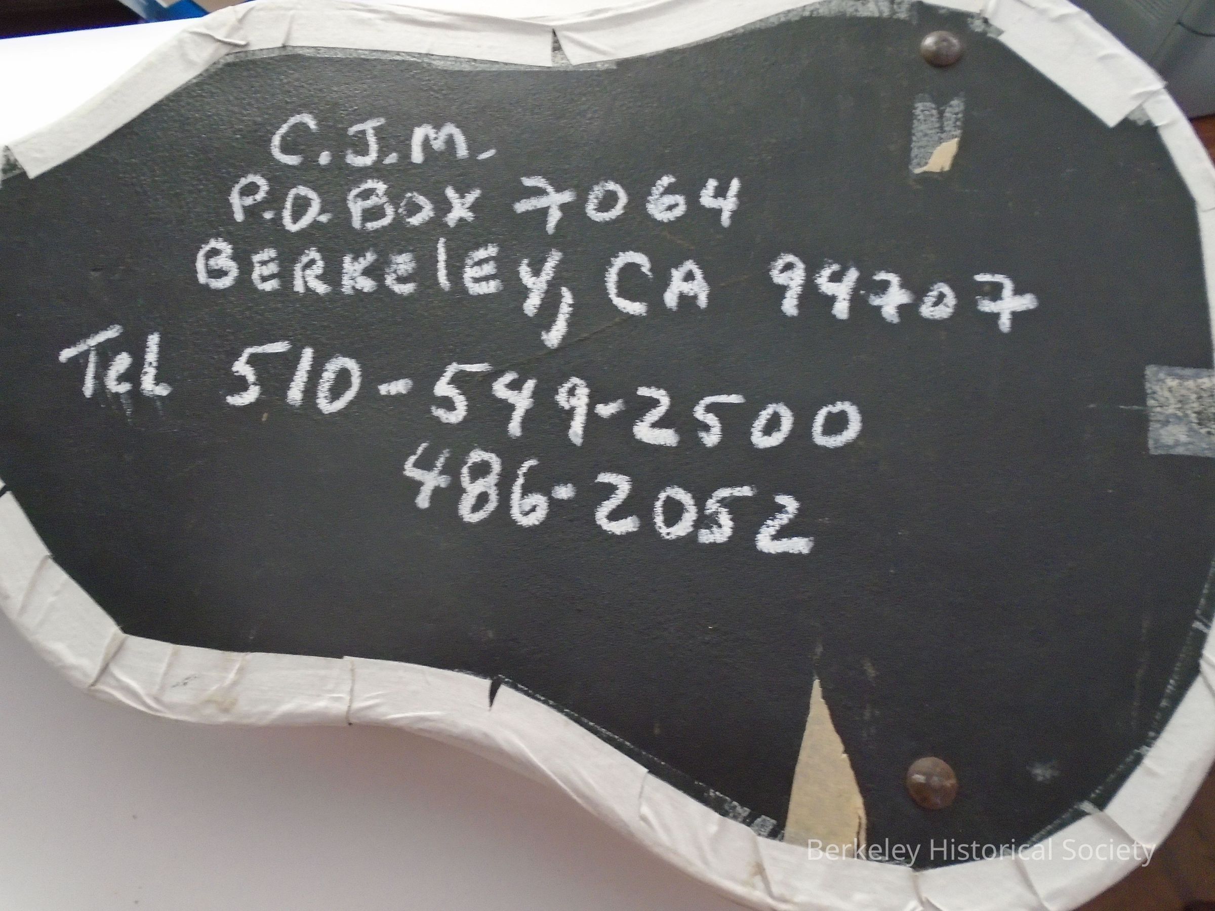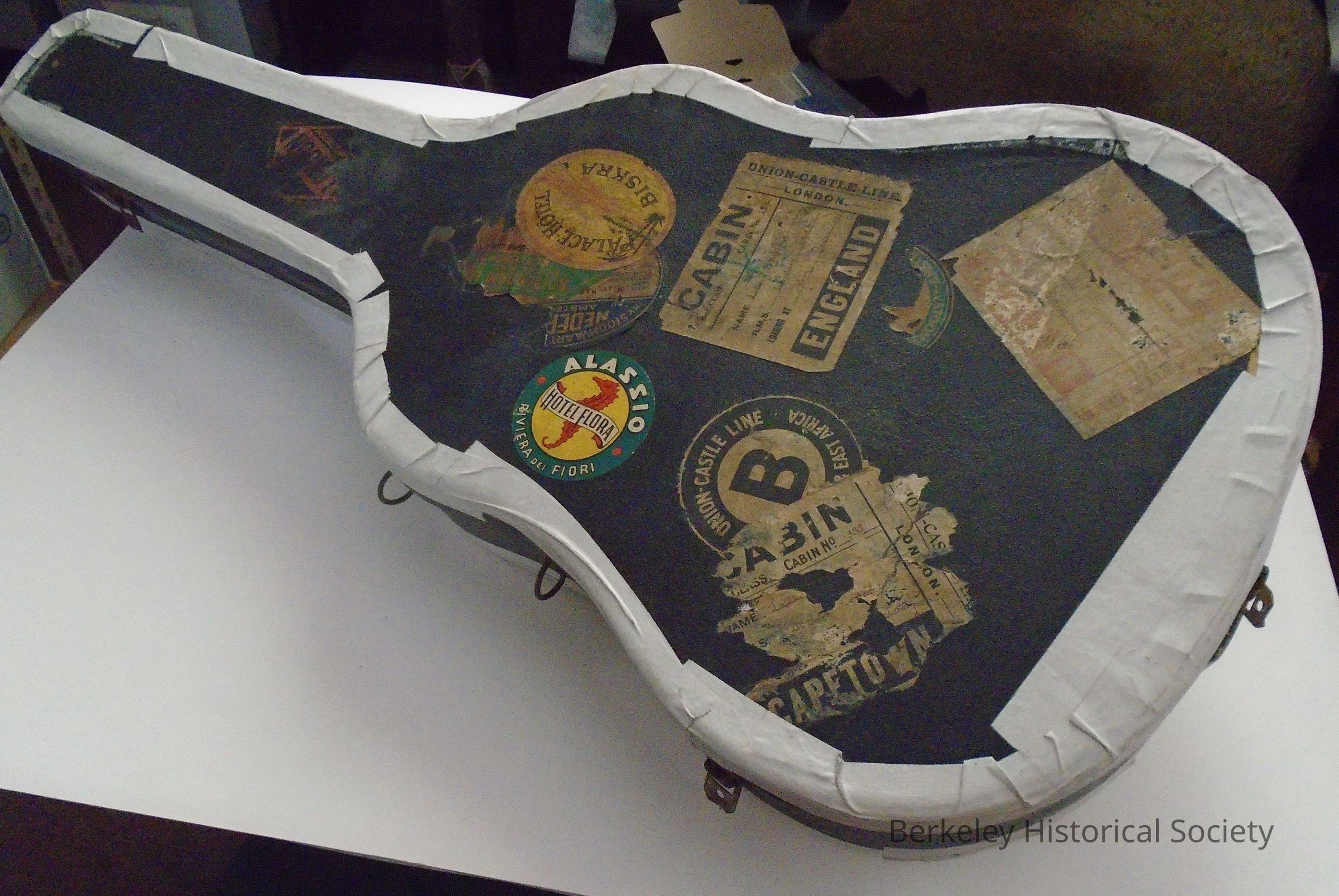 Guitar case used by Country Joe McDonald. Numerous hotel and cabin decals on top. White tape around edges (repair). Bottom shows C.J.M., PO Box 7064, Berkeley, Ca, 94707, Tel. 510-549-2500, 486-2052. On side: 3 latches, 3 hinges, 2 loops for handle (handle missing), 1 lock (does not open, key is missing).