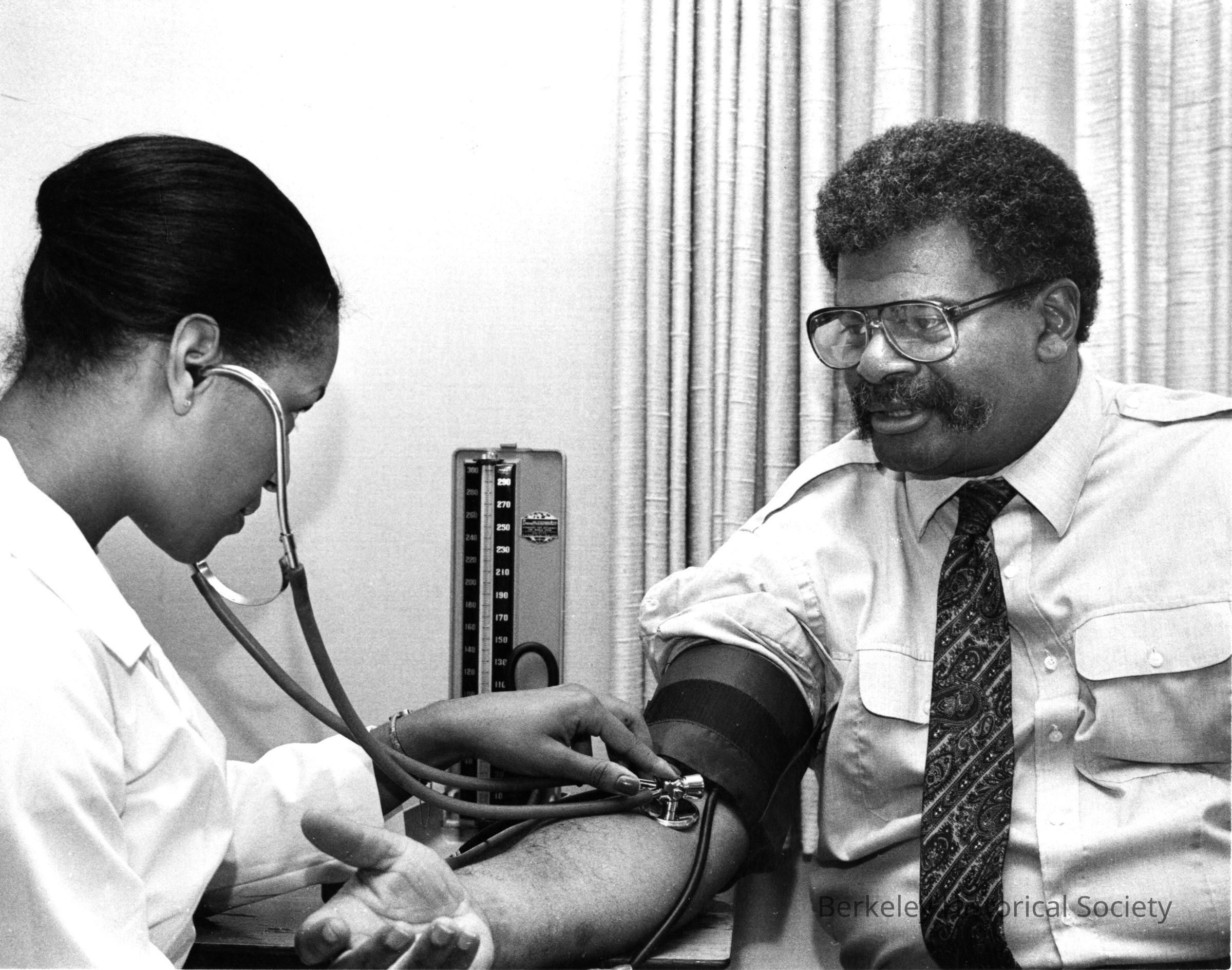 Joyce Lewis, public health nurse, taking his blood pressure, April 30, 1981. Location not named.Dimensions