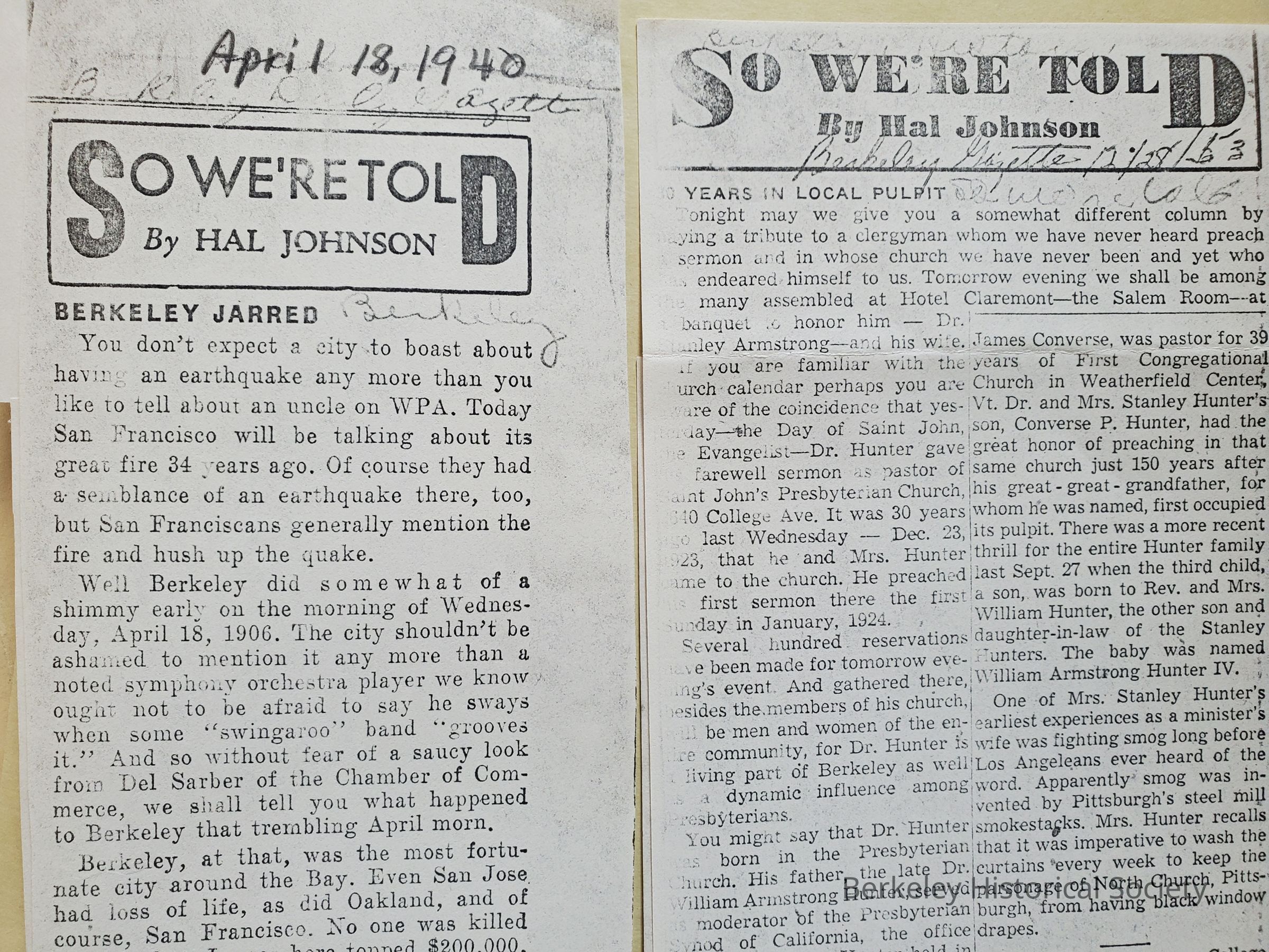 Hal Johnson articles for Berkeley Gazette, "So We're Told" 1941-1954.