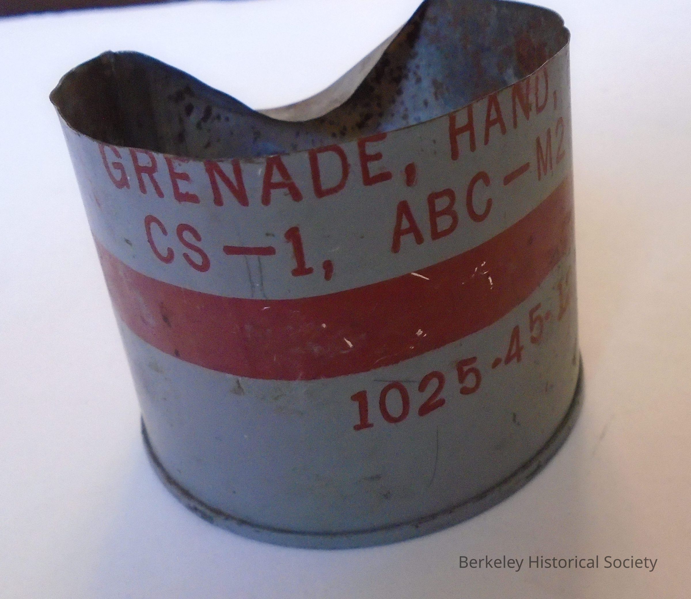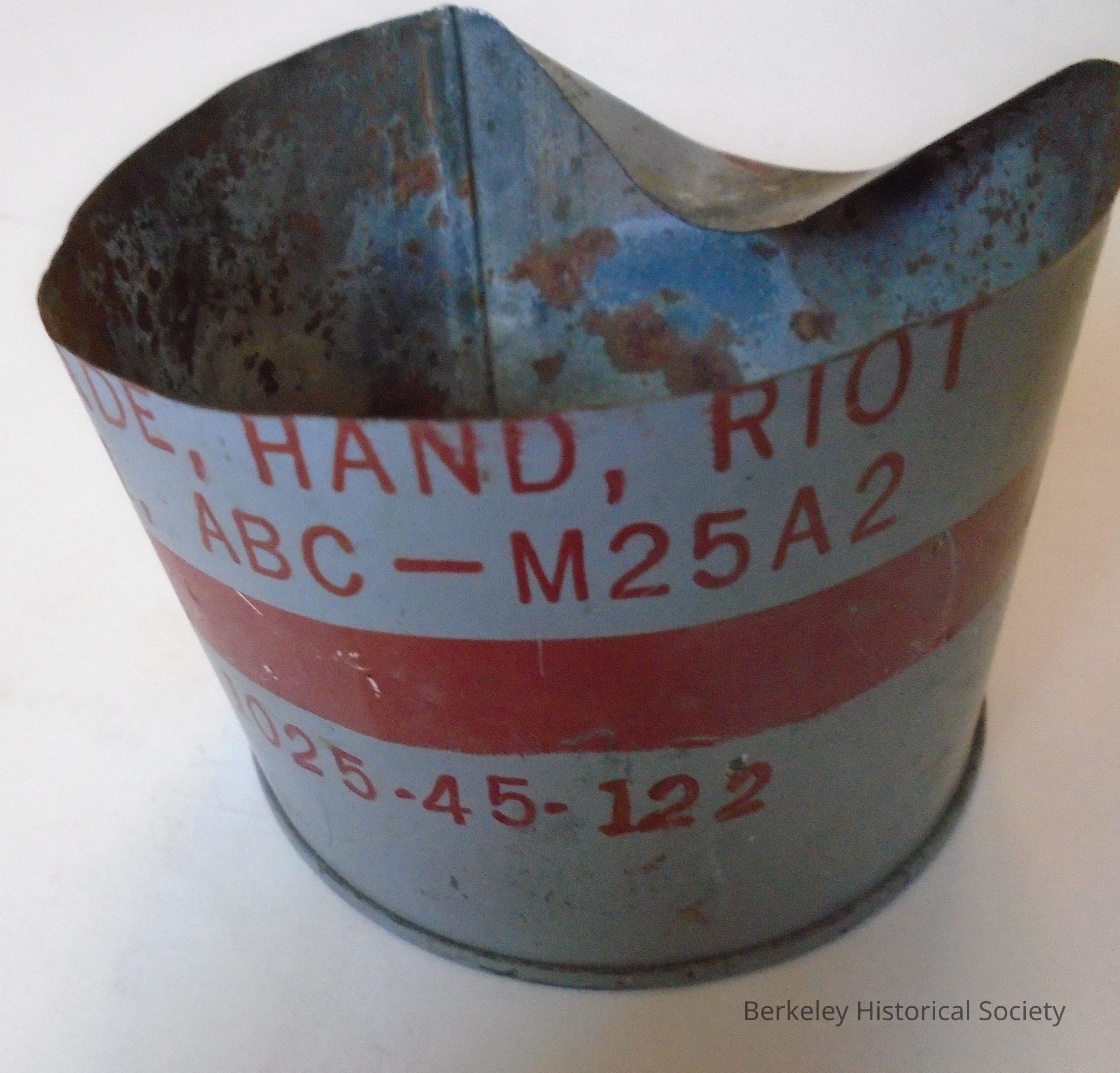 Hand grenade case. Used in People's Park protests. Metal, rusted inside, top of case gone.