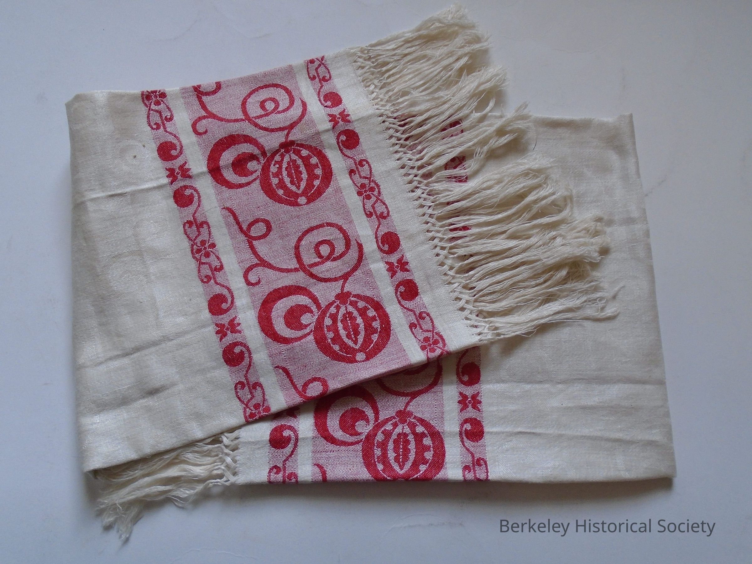 White and red linen damask towel with fringe. See also Shafer Family (paper) Collection in upstairs archives. See also a brief Family History in Object ID # 1995.002.001.