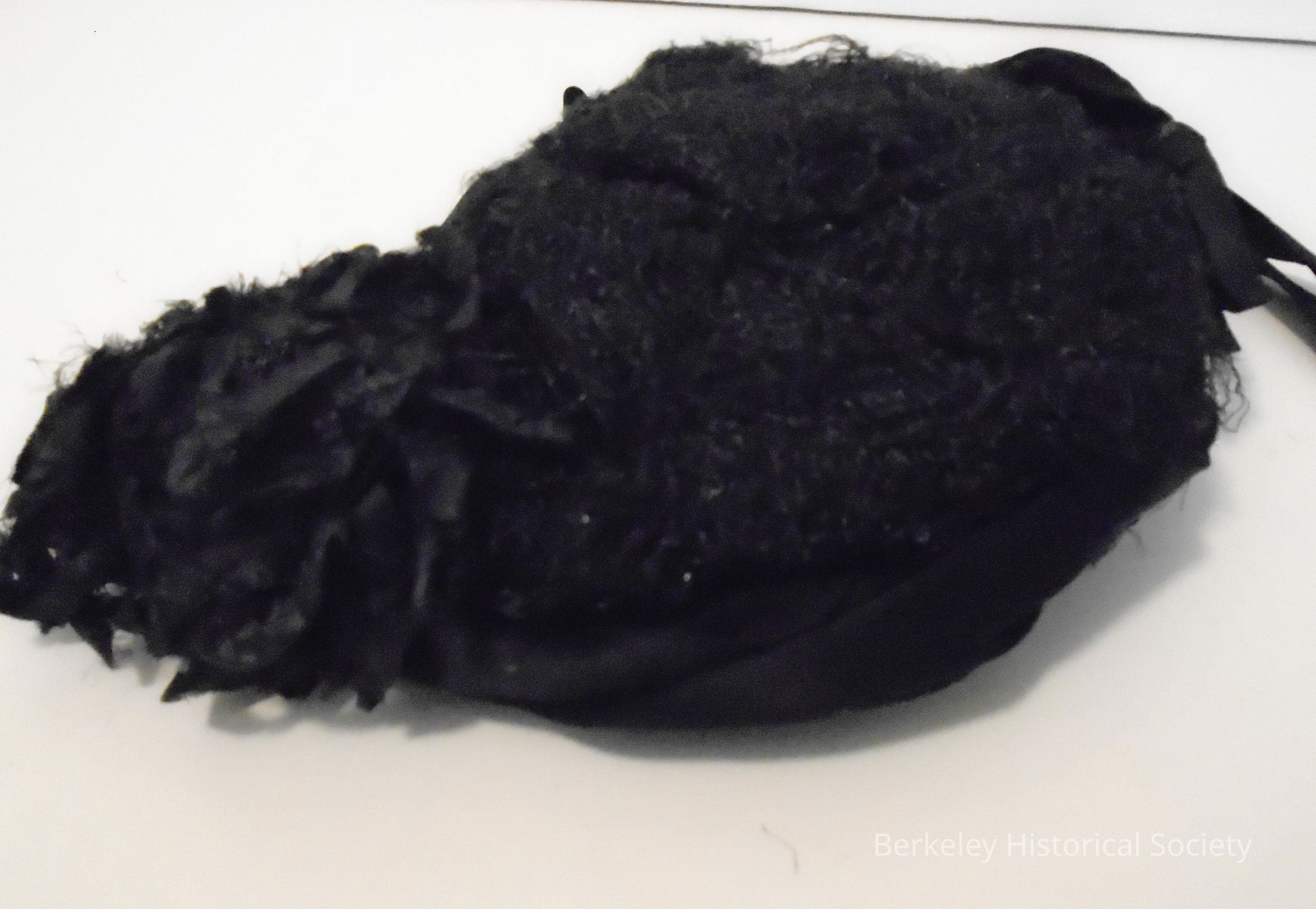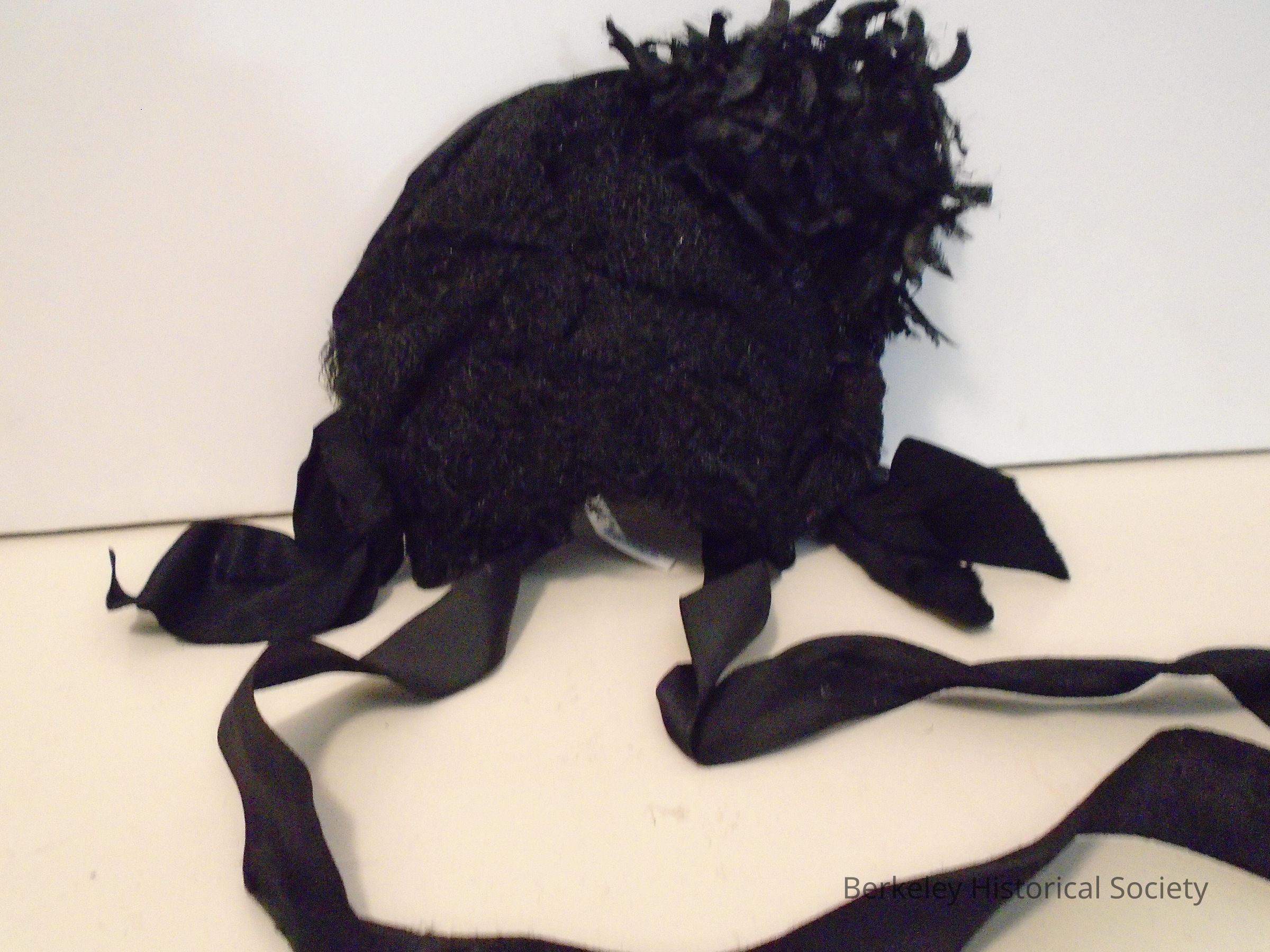 Black horsehair woman's hat. Wire frame, flower and ribbon decor with ribbon chin ties.