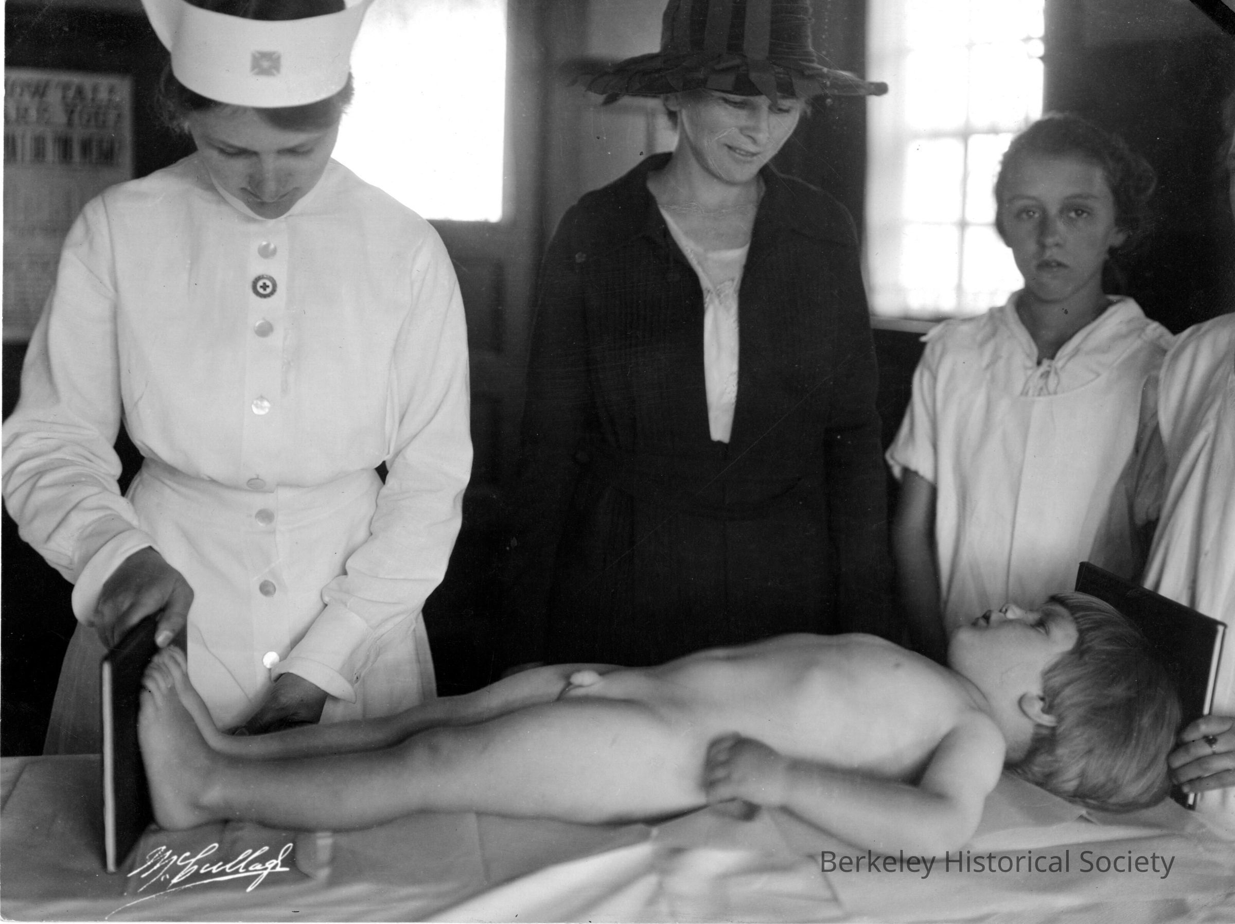 Baby clinic: very young child lying nude being measured by nurses; woman (mother?) and older child looking on.Other Names and Numbers