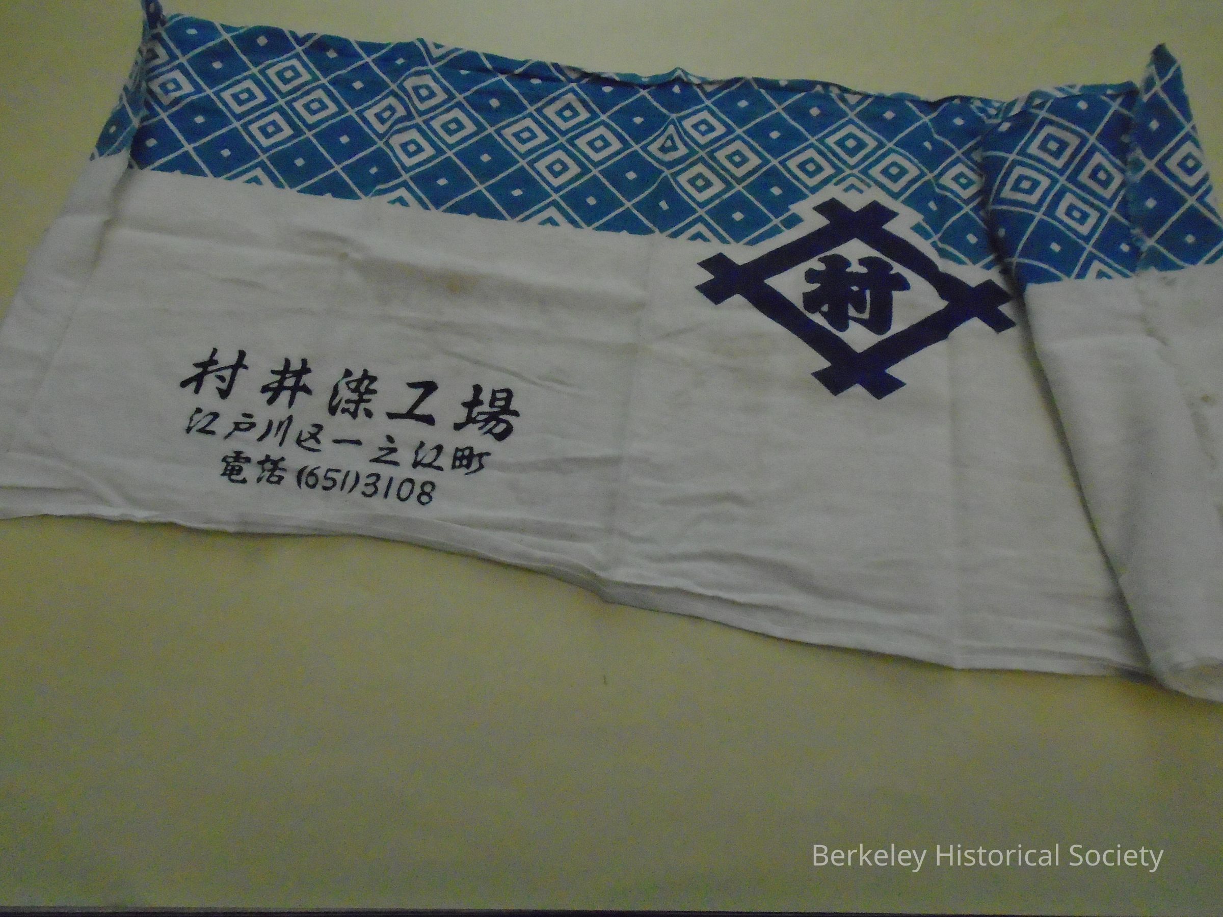 Rectangular cotton headband. White with blue print across top, japanese character (logo?) in middle. Japanese characters and telephone number (615) 3108 at bottom. Headband of the type worn by laborers (carpenters, gardeners) around head & knotted in back, From Margot Guinn estate.Made/Created