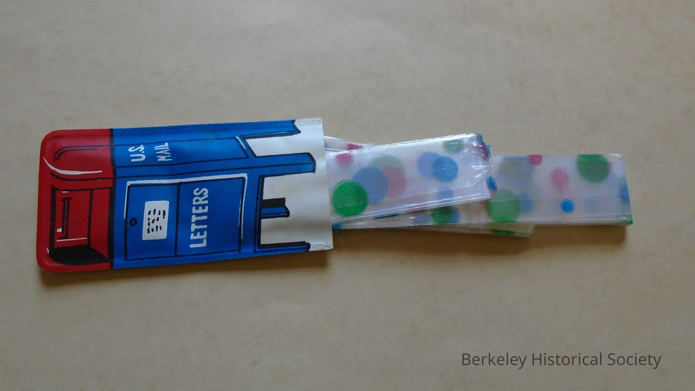 Plastic head scarf or rain hat folded accordion style in plastic holder. Scarf has multicolored polka dots, no ties. Holder is a picture of a mailbox on one side. The other side has PIP 313, 2634 Ashby Ave., Berkeley, CA 94705 (415) 848-4198. (PIP was a print shop.)