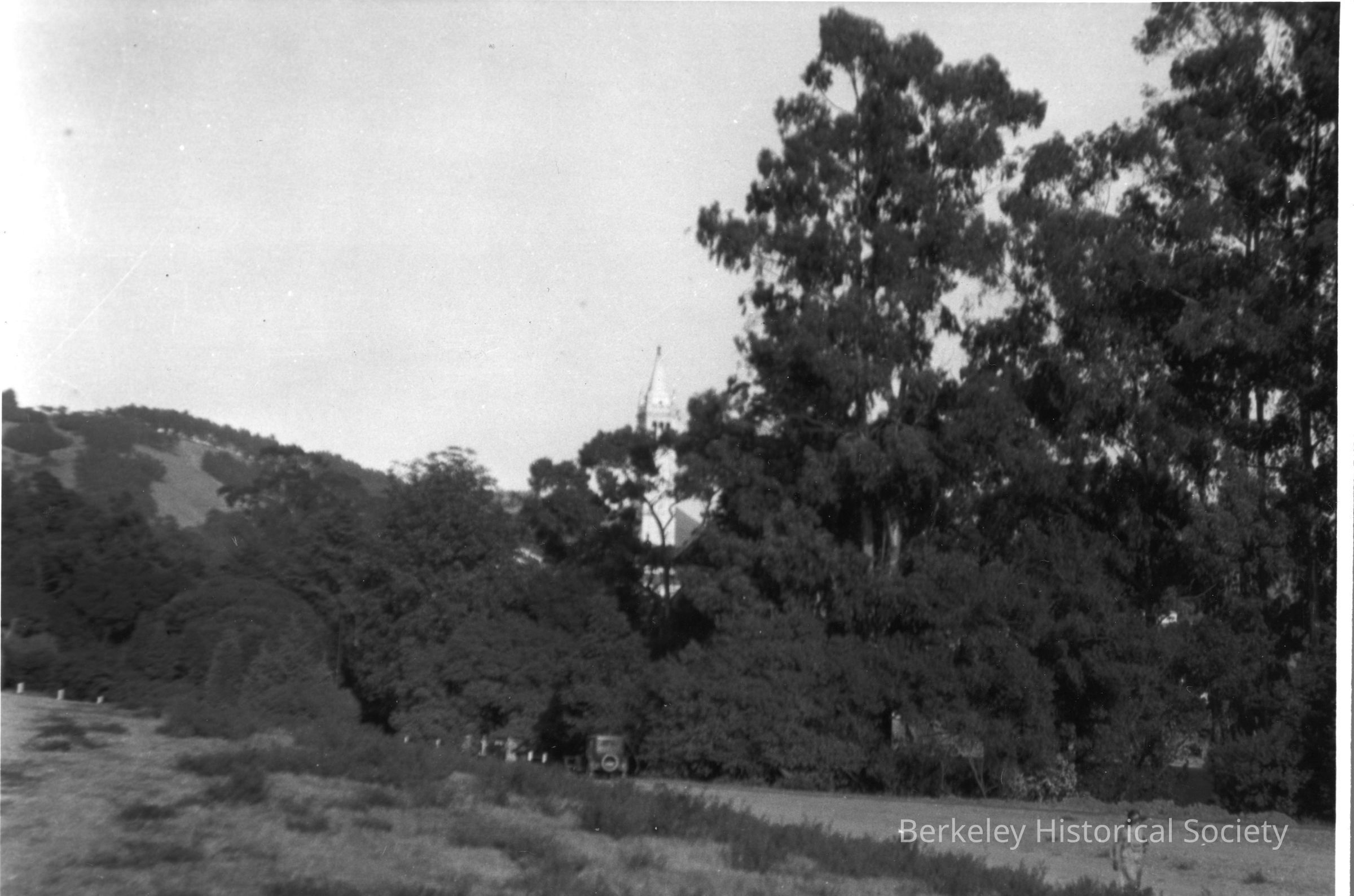 Automobile on unpaved Hearst Avenue, Campanile visible through trees