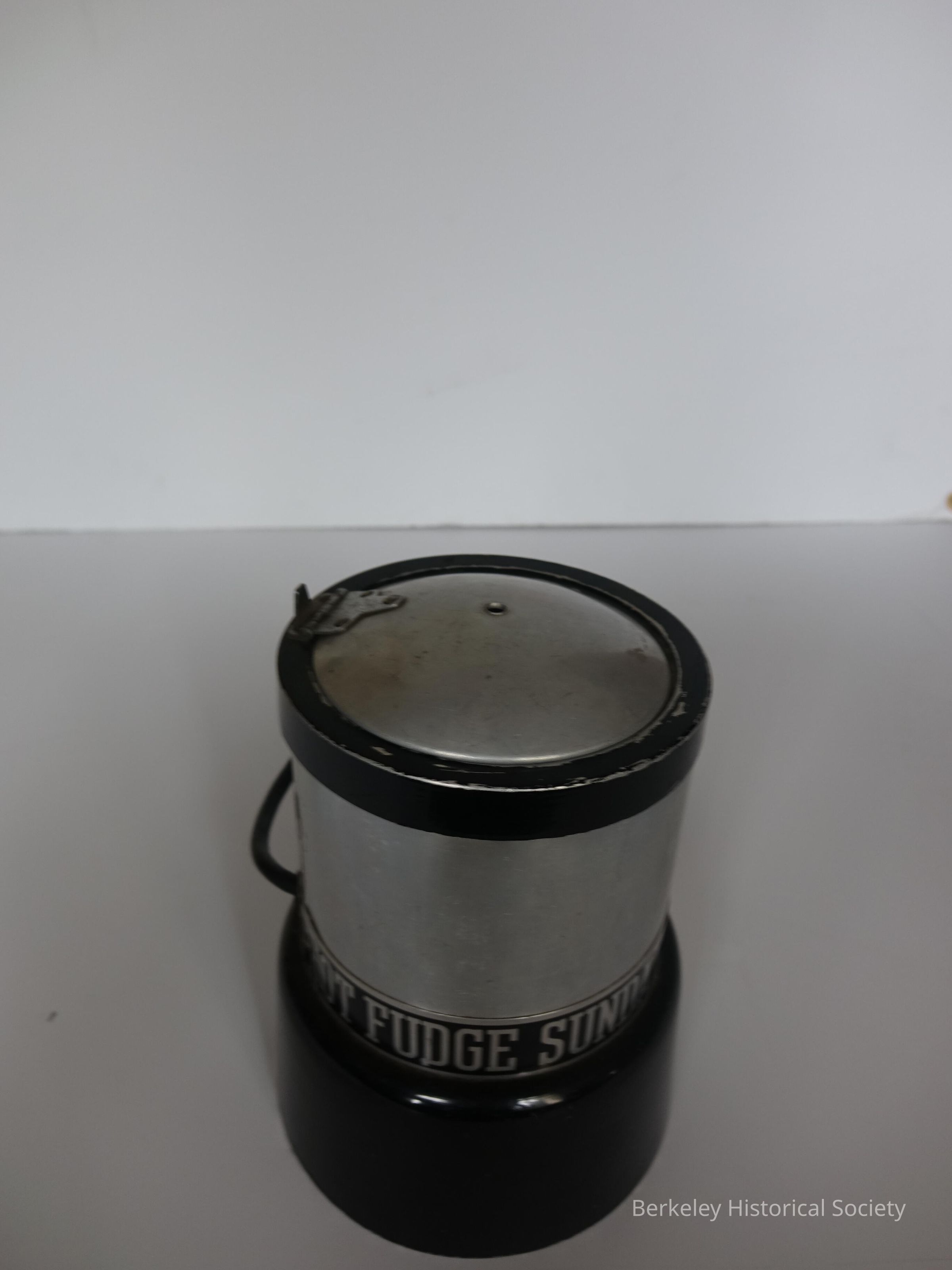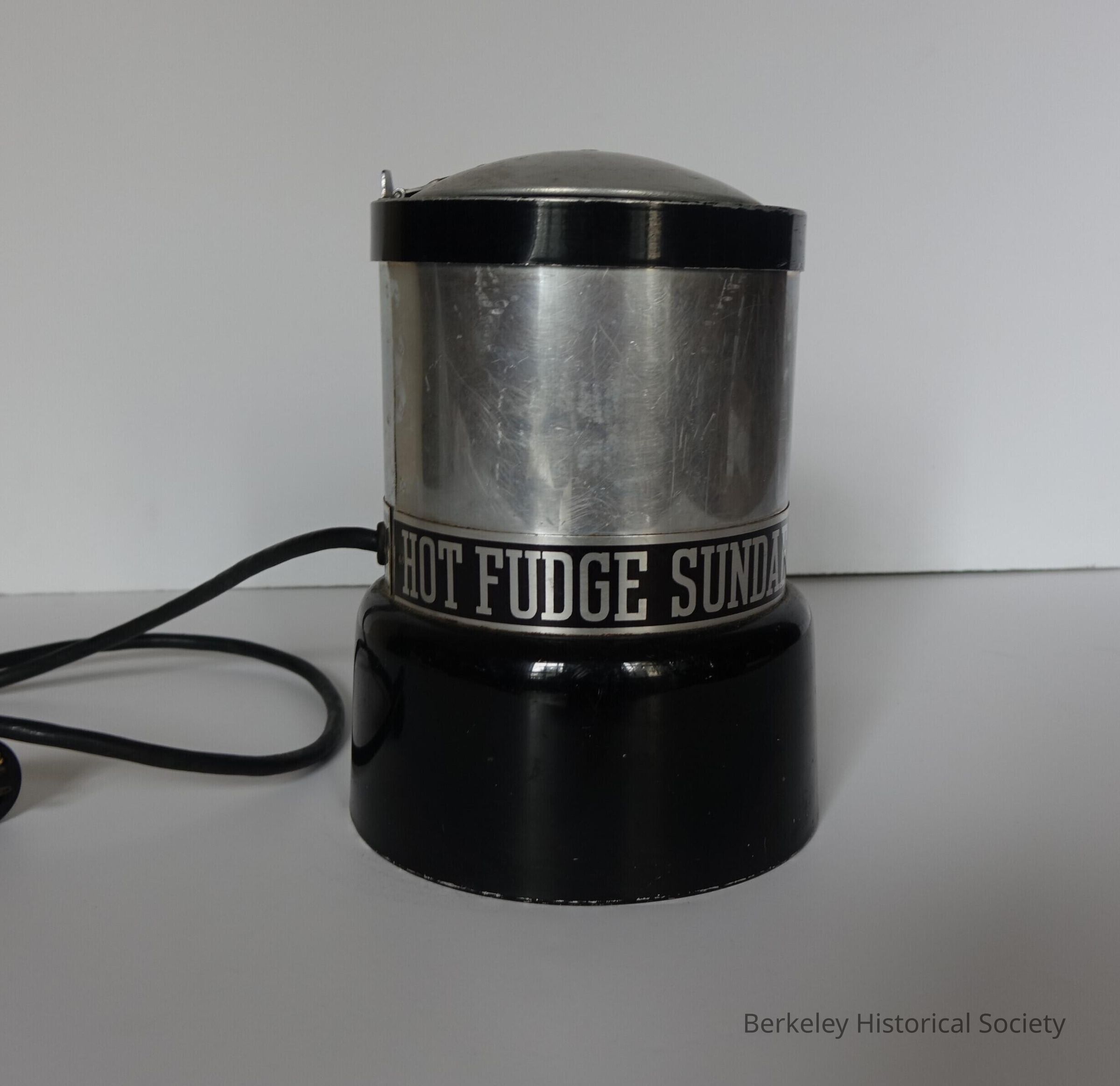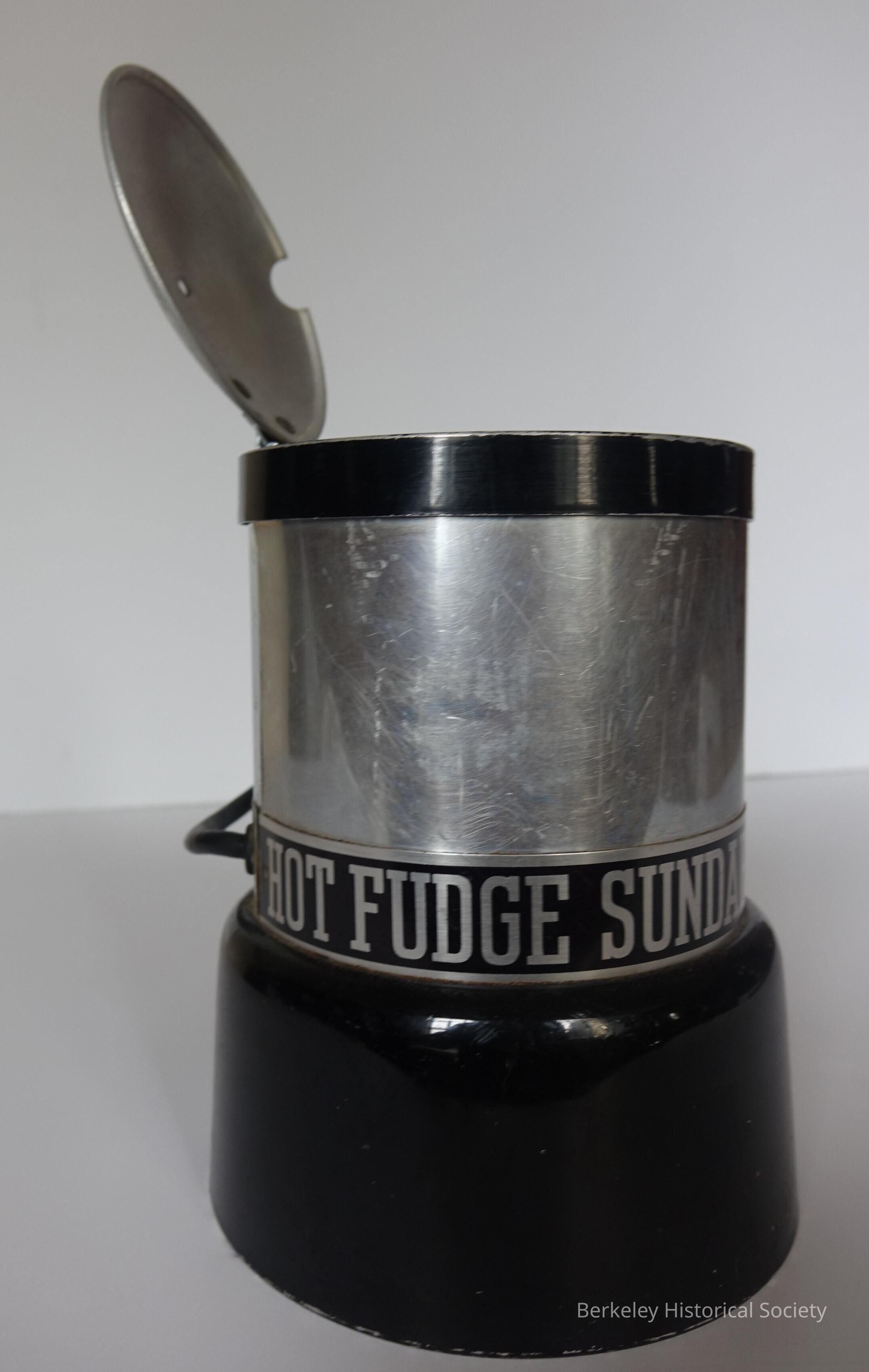Hot fudge heater with lid, black base with "HOT FUDGE SUNDAE" lettered around bottom of aluminum cylindrical body. Inside is ceramic tub for sauce, electrical heating device. Plastic - coated electrical cord coming out of back. Used at Ozzie's Elmwood Fountain.Made/Created