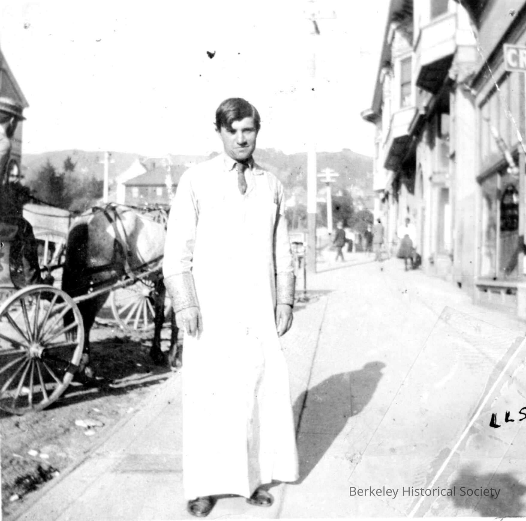 Herman Reisman, standing outsude of a shop on Vine St. A horse and wagon is in the background, with Joe Verdi at the reins.