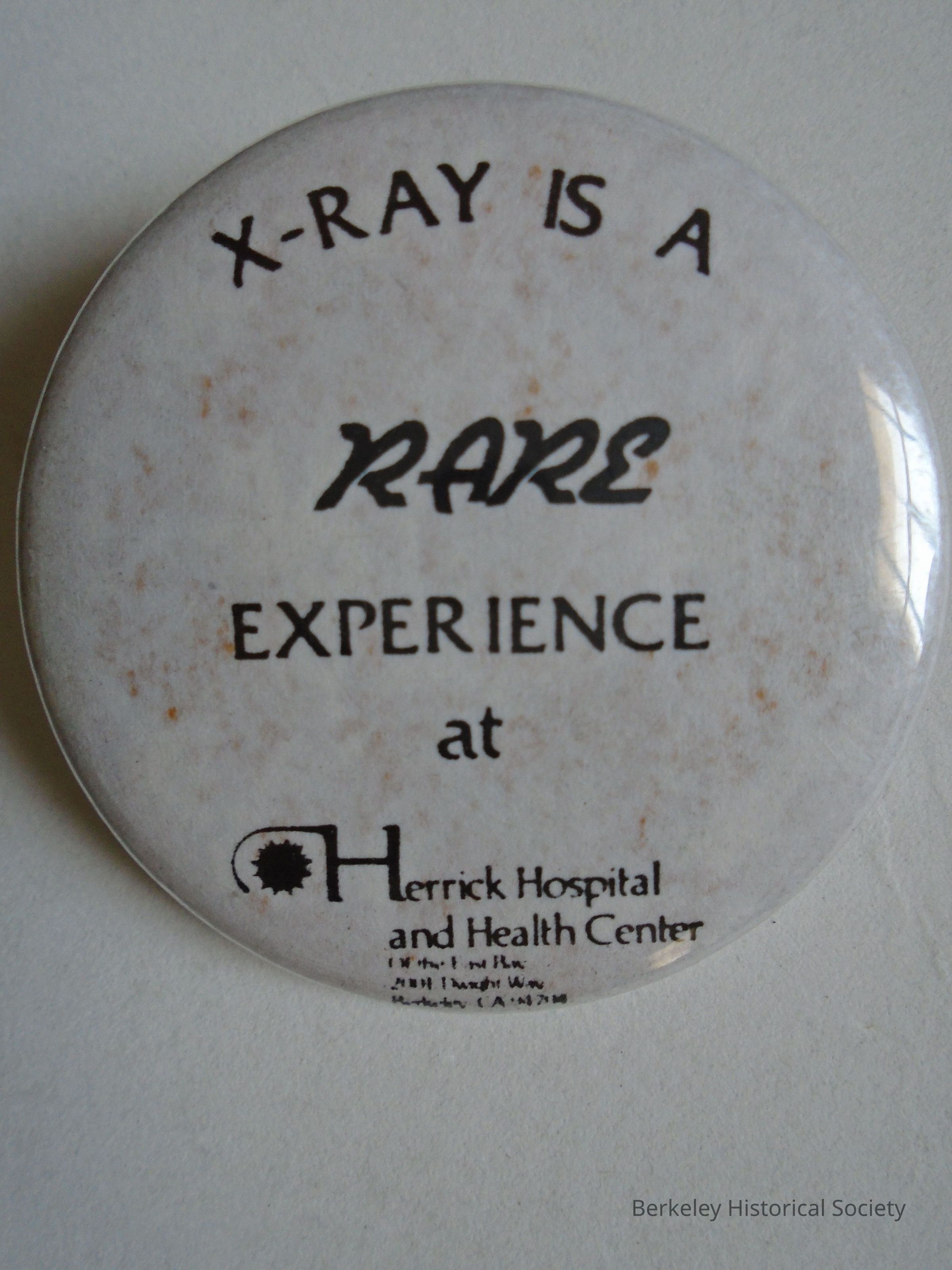 Round metal white button with "X-RAY IS A RARE EXPERIENCE at Herrick Hospital and Health Center".