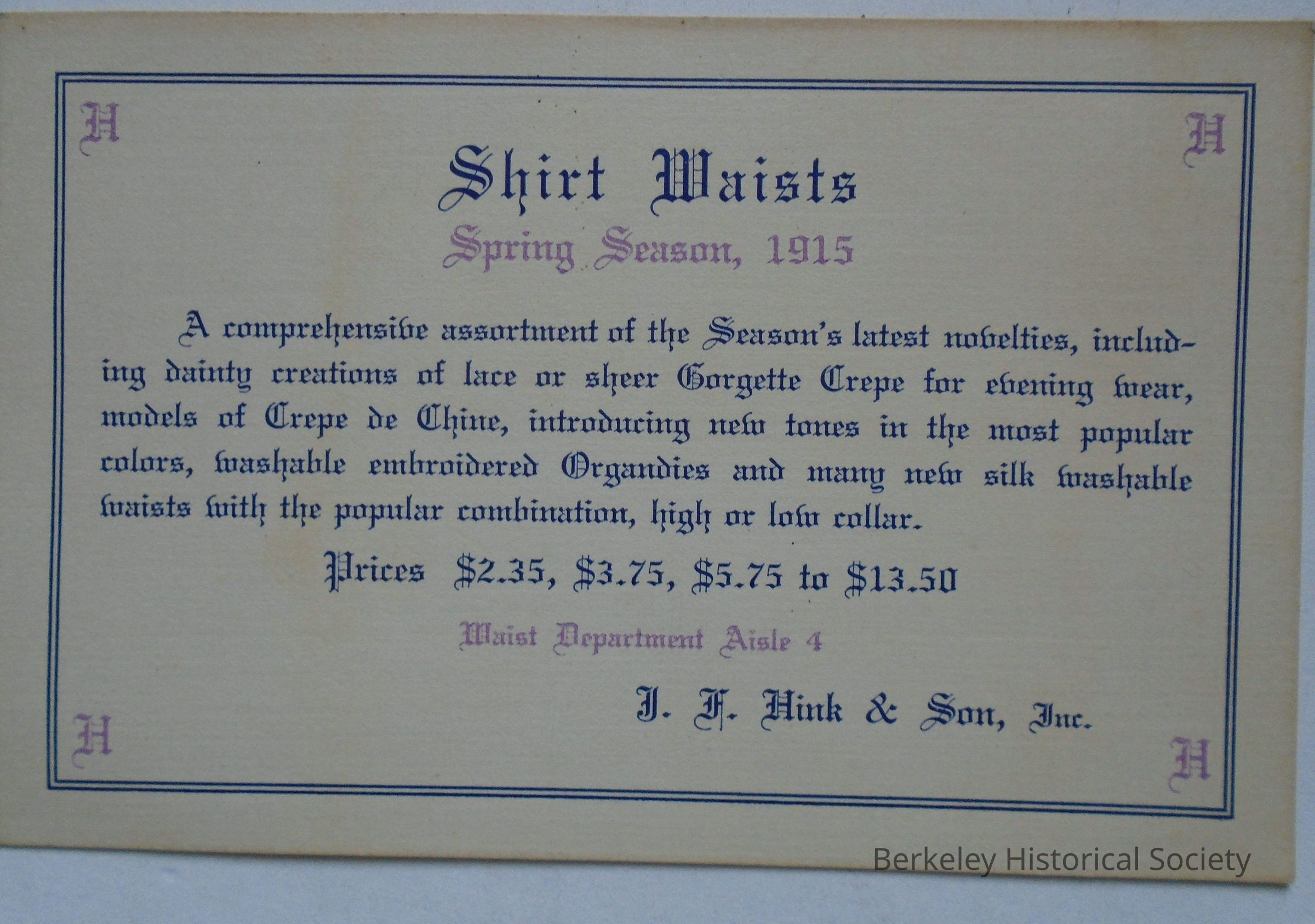 Paper advertising card for J.F. Hink & Son, Inc. "Shirt Waists, Spring Season, 1915" with prices and descriptions. Nothing on back side.Dimensions