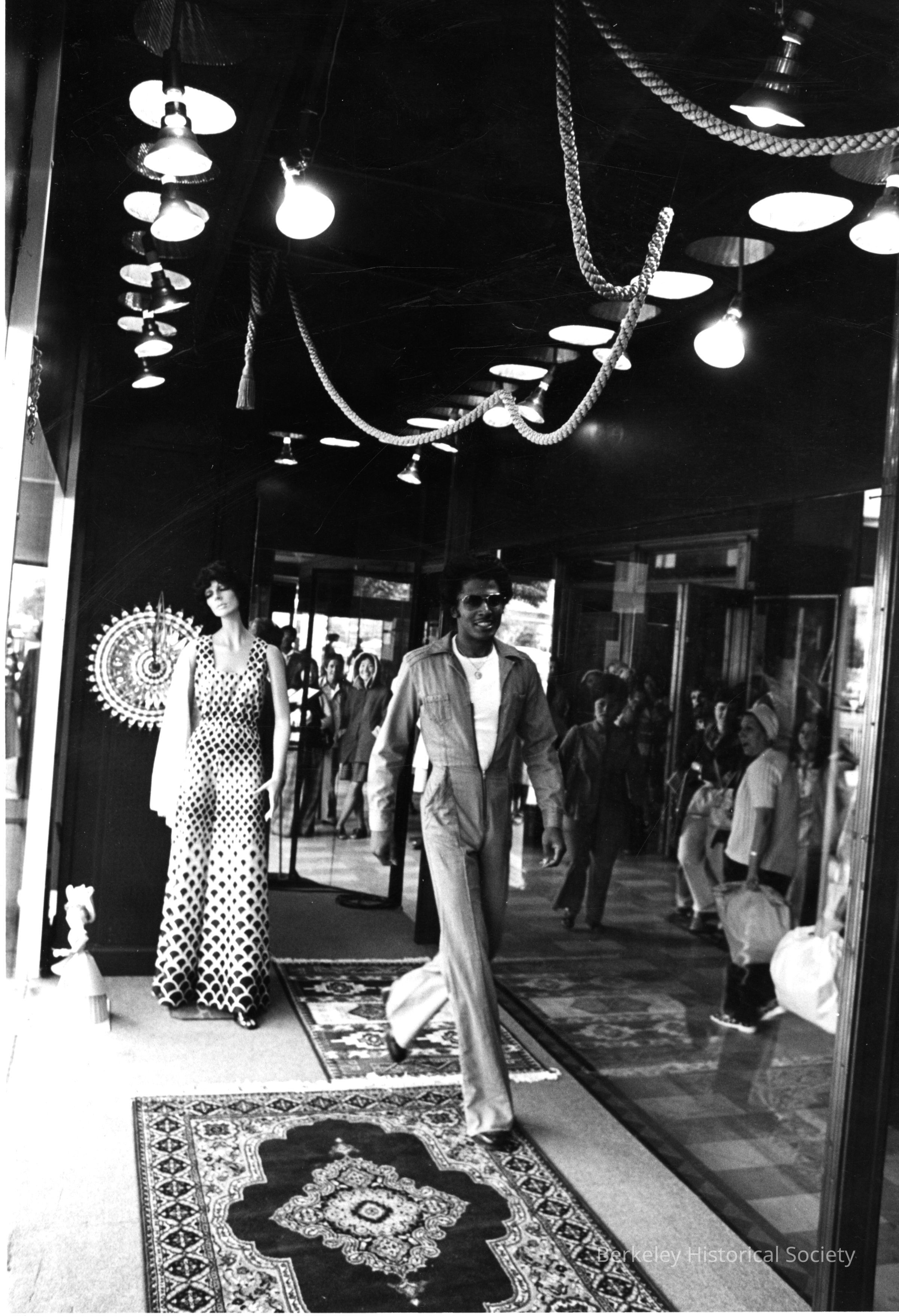 Man walking in walkway between showcase windows.Made/Created