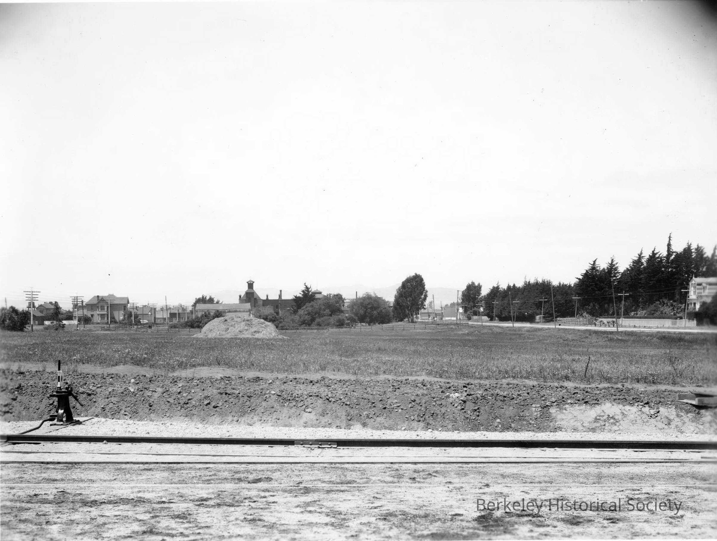 Field with haystack, buildings, trees, railroad tracksMade/Created