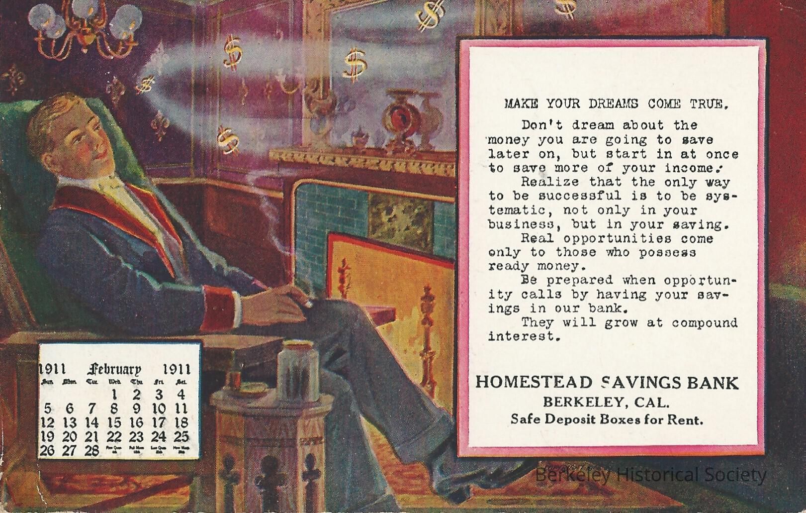 Art work depicts man in reverie in chair by fireplace; text begins "Make you dreams come true."Lexicon