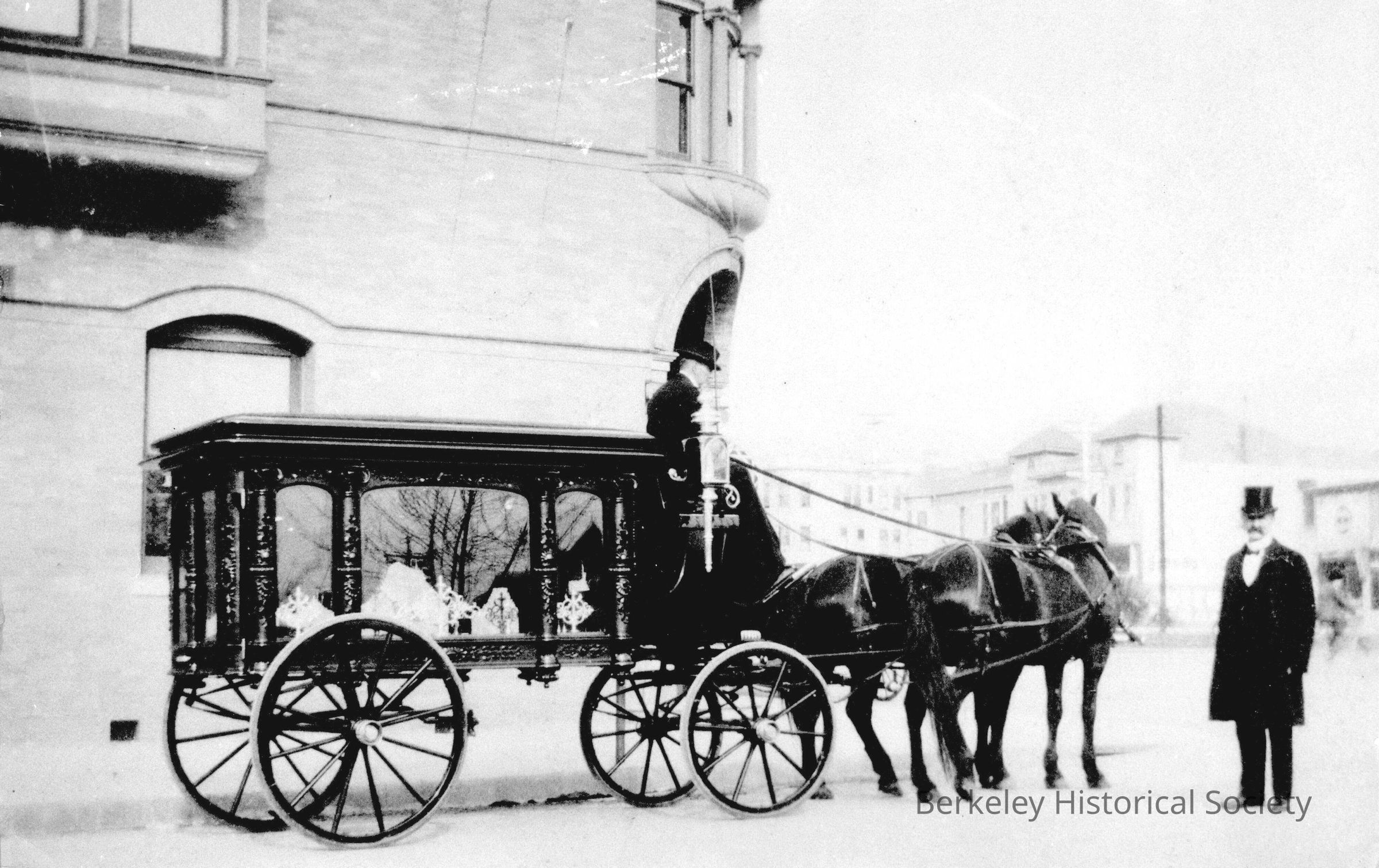 Horse-drawn hearse with crew and team, 1890 Durgin & Bleakley Undertakers 2121 Center Shattuck & Allston (?) 343-189-0200