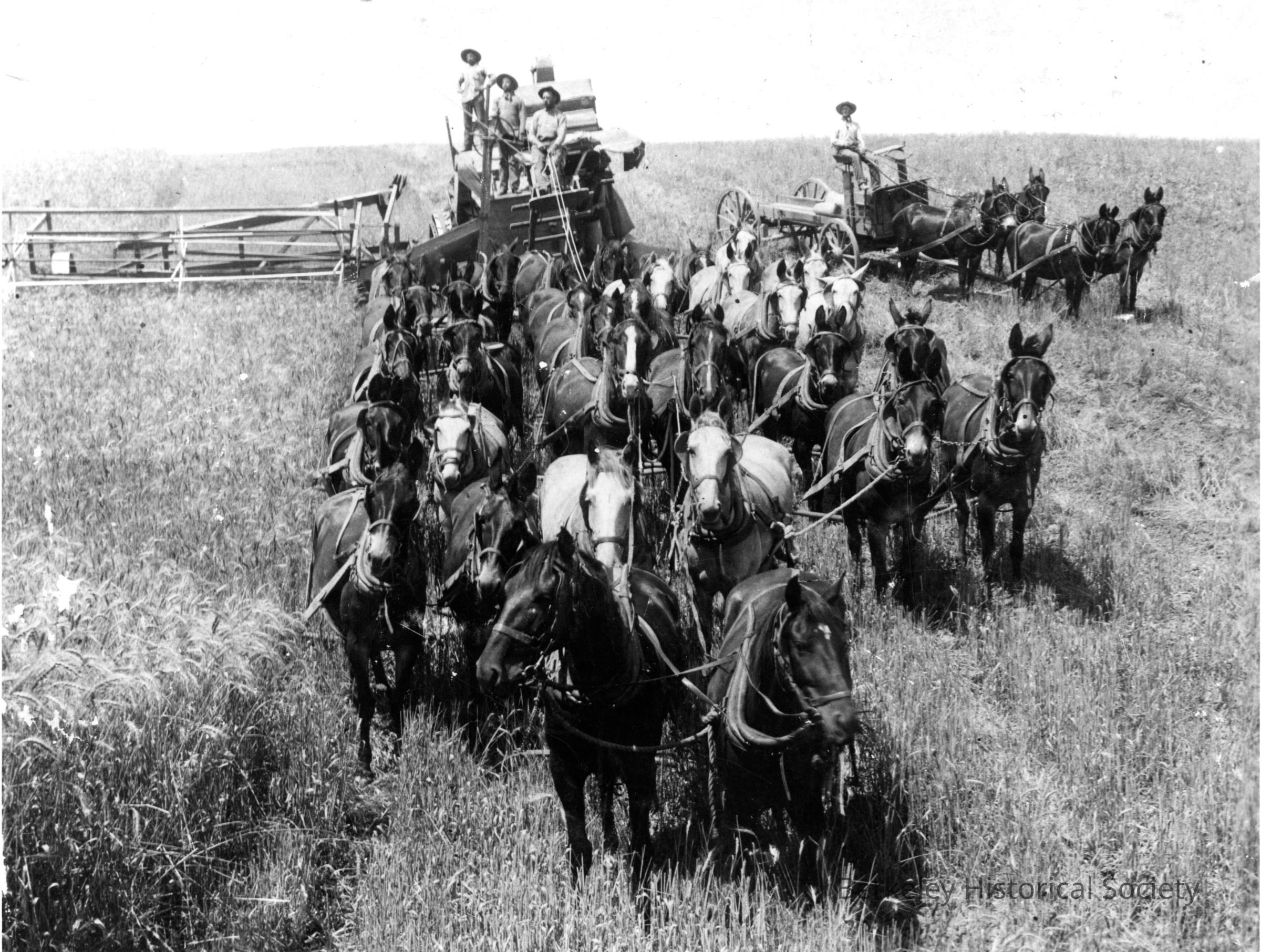 Large team of horses. Alongside small team of donkeys pulling card. Identified as at Sacramento and Cedar.Other Names and Numbers