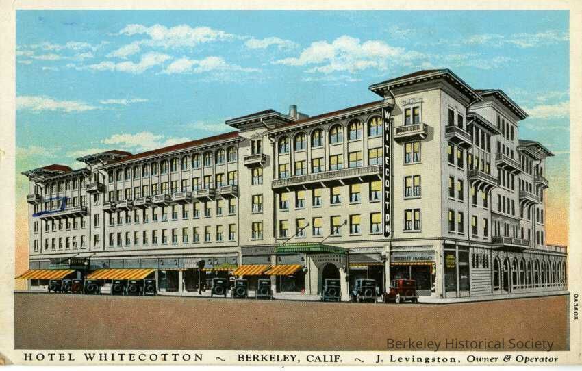 Divided back postcard with color image of Hotel Whitecotton with blue sky filled with clouds. Image is surrounded by white border with text at bottom (Hotel Whitecotton ~ Berkeley, Calif. ~ J. Levingston, Owner & Operator). From 1918-1942 the hotel was owned by William Whitecotton and named for him. Blue ink message is present.