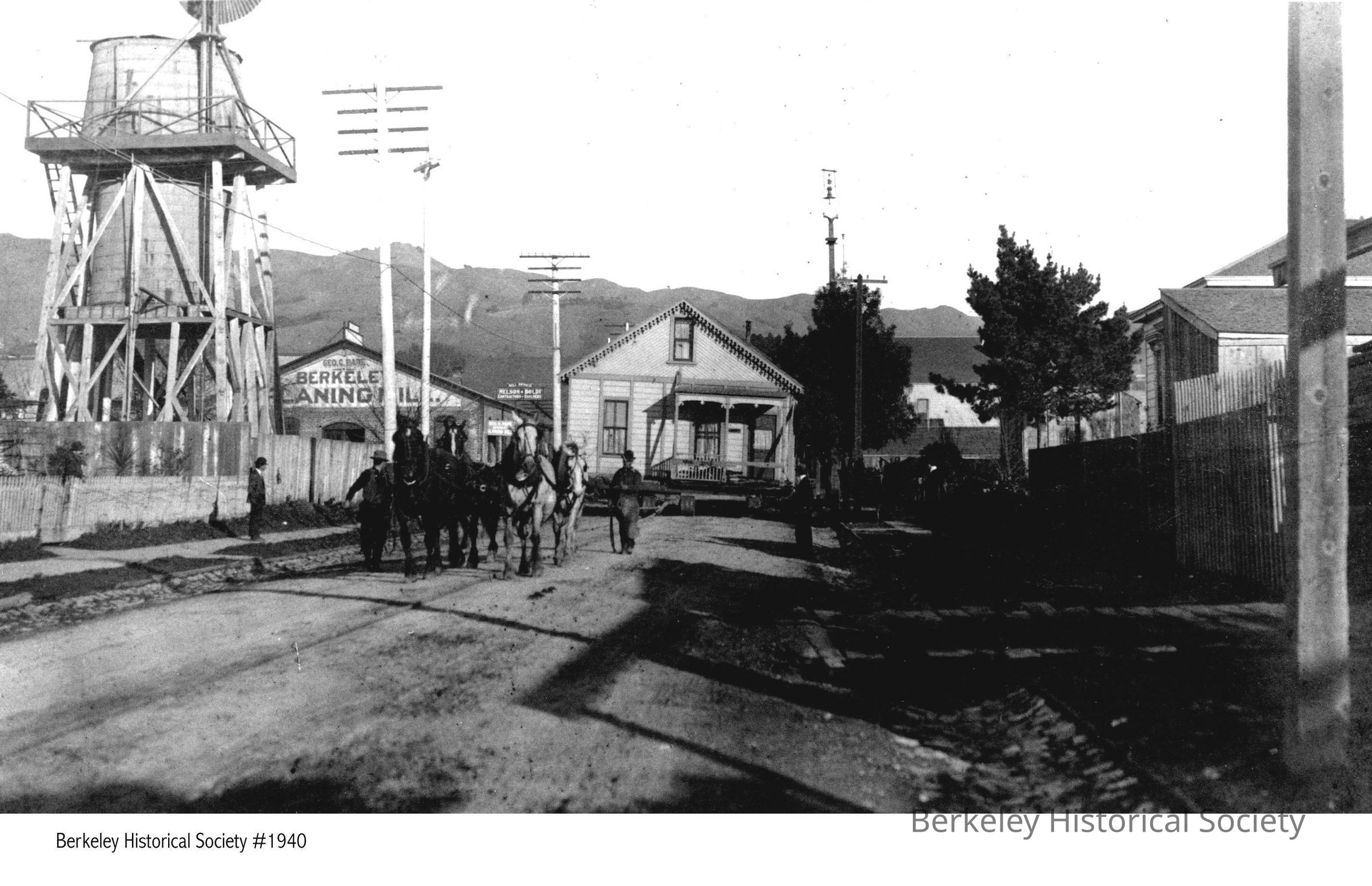 Moving Meinheit house; team of horses towing house, on Addison Street[?]. Tank house and Berkeley Caning [Mill?] to left.