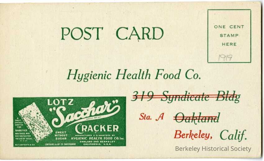 Postcard for ordering display of crackers from the Hygienic Health Food Co. Address on postcard: Sta. A, Berkeley, Calif. Former address in Syndicate Building, Oakland is lined out.
