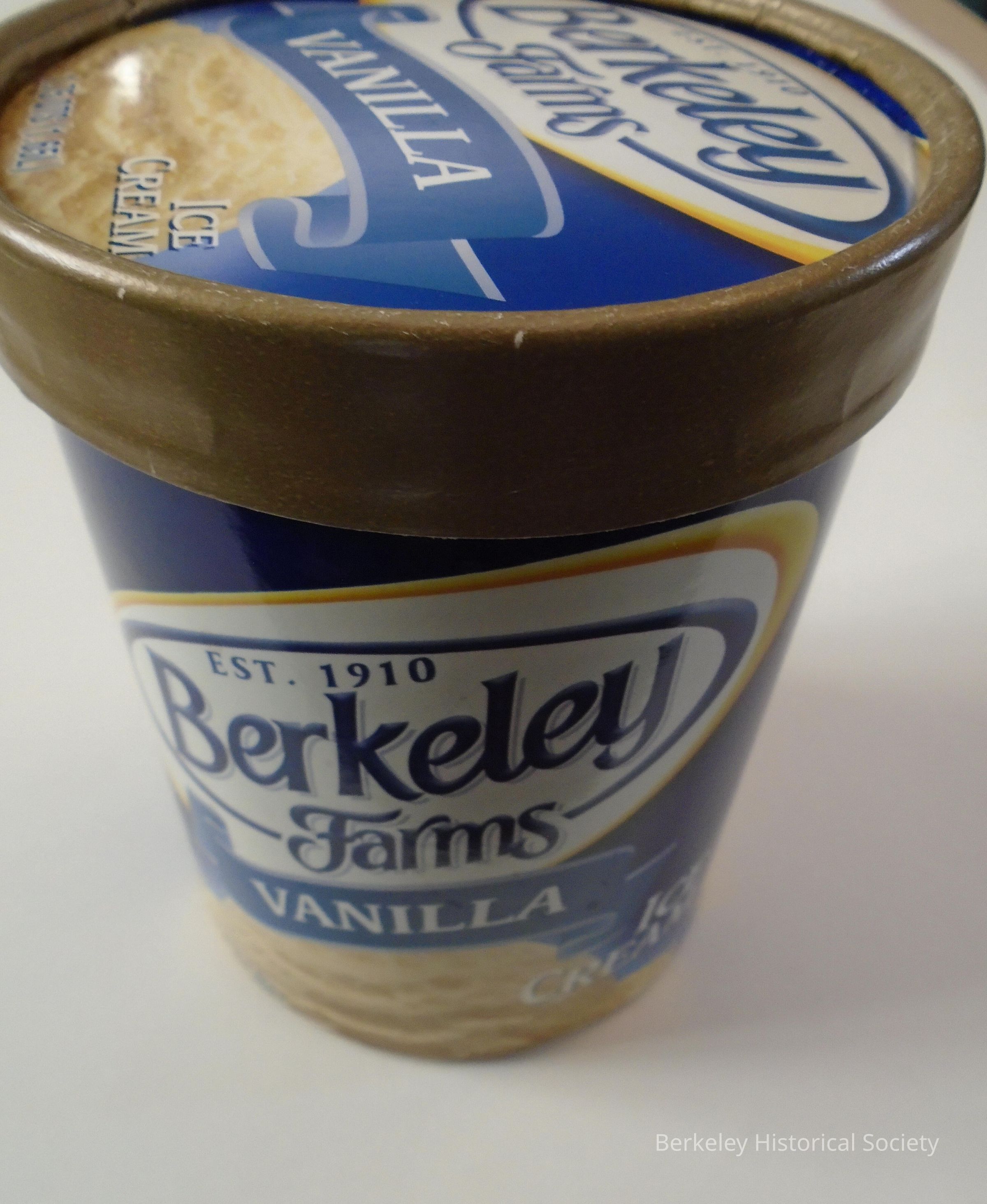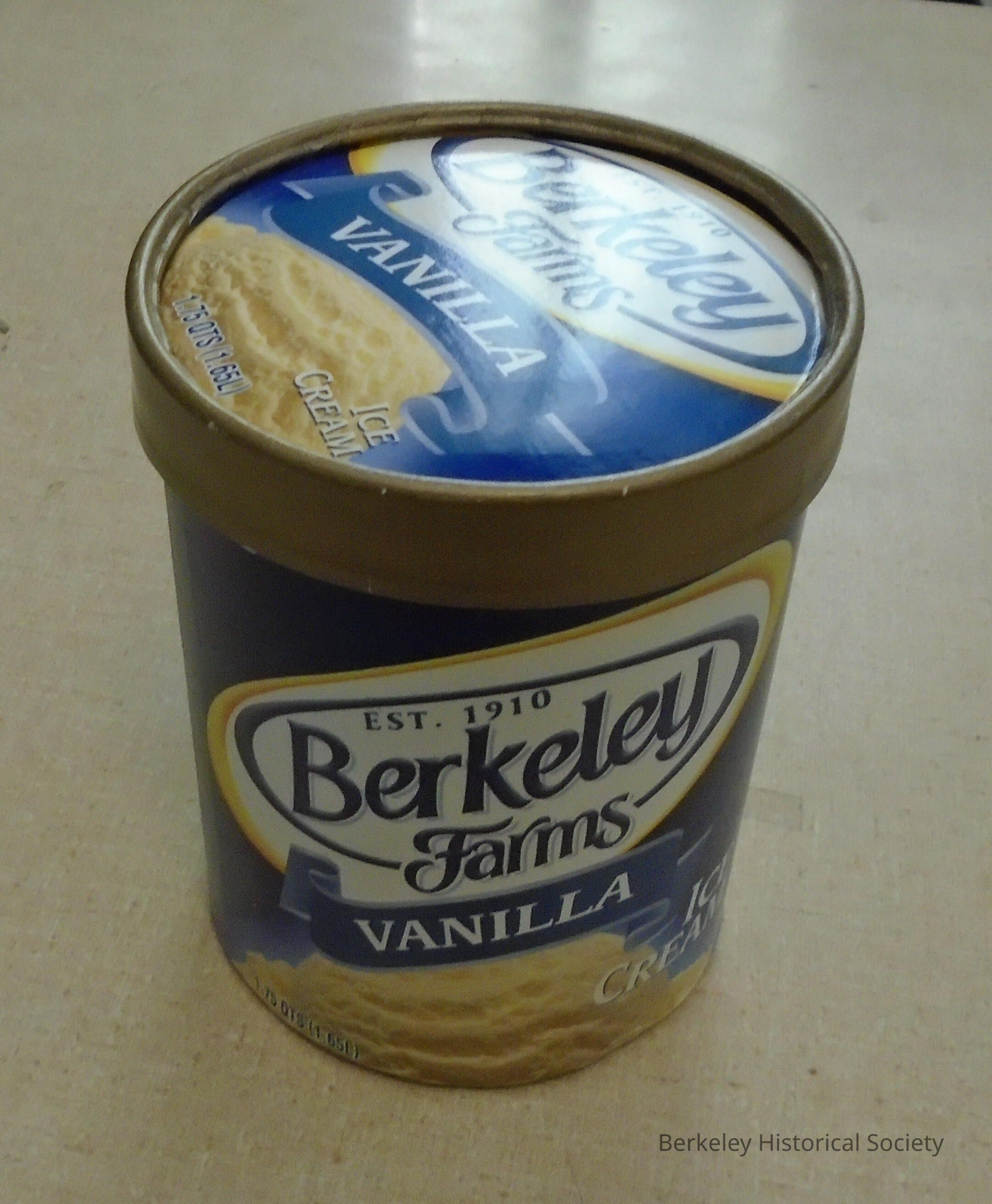 Berkeley Farms cylindrical, paper, vanilla ice cream container with lid. Blue and white, 1.75 qts.Lexicon