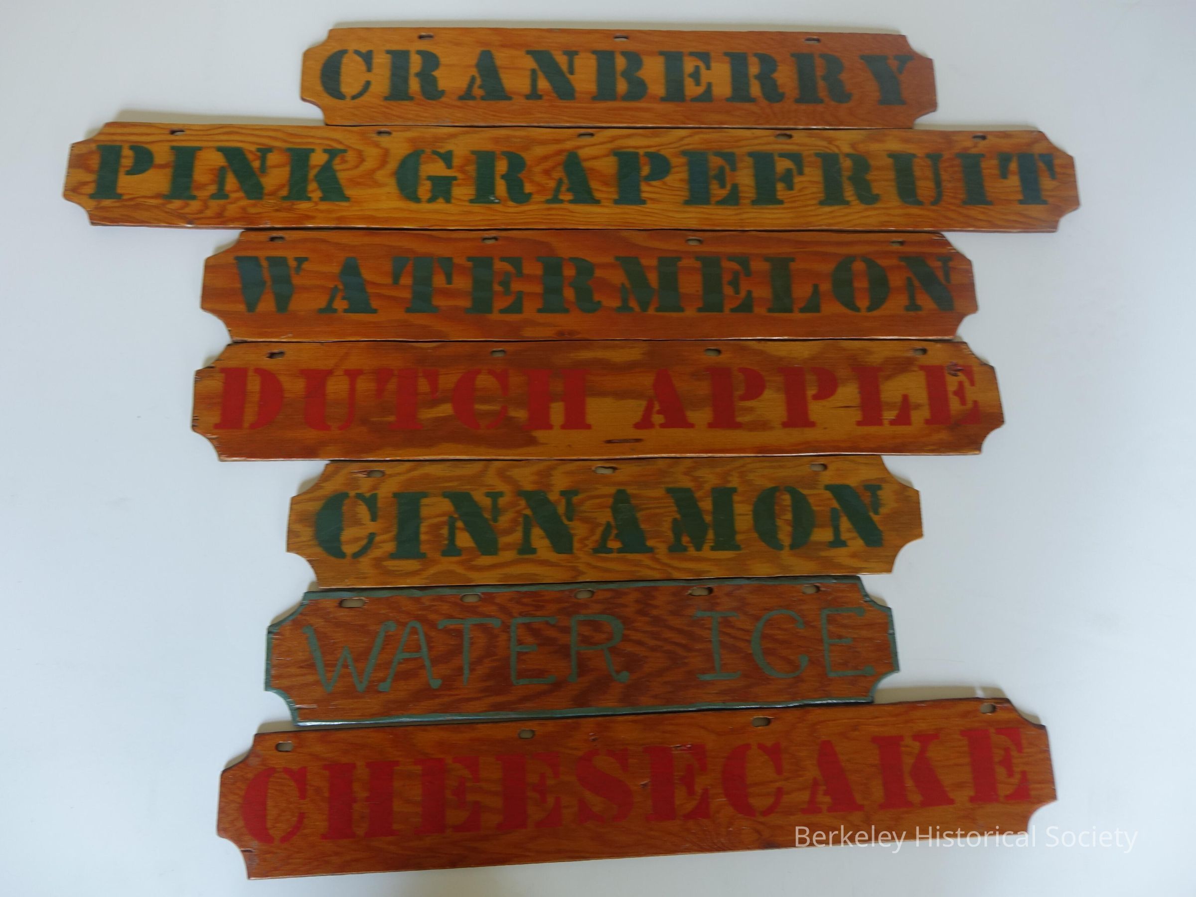 23 wooden ice cream flavor signs: natural colored, varnished plywood in miscellaneous lengths, with stenciled letters in miscellaneous colors. Holes along top for hanging. Used in McCallum's Famous Ice Cream at 1825 Solano Ave. Advertised 40 flavors and a soda bar. In business early 1960's-through 1990.