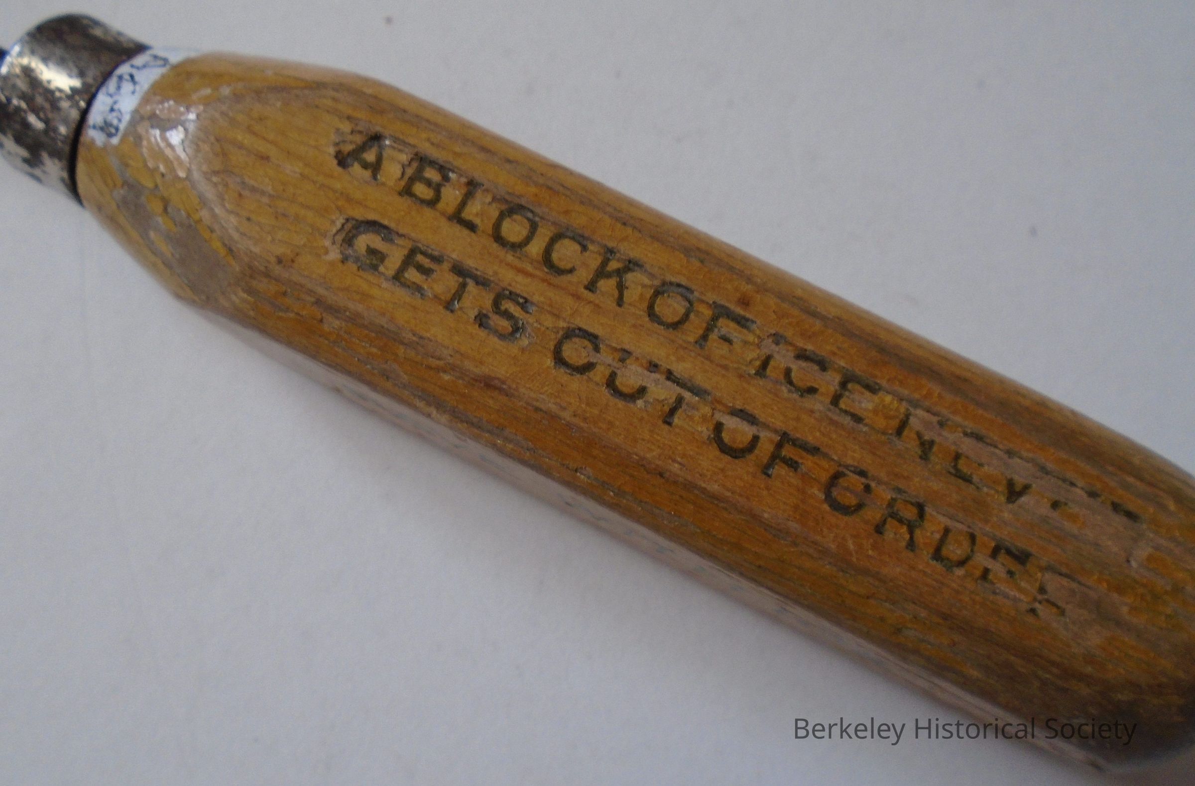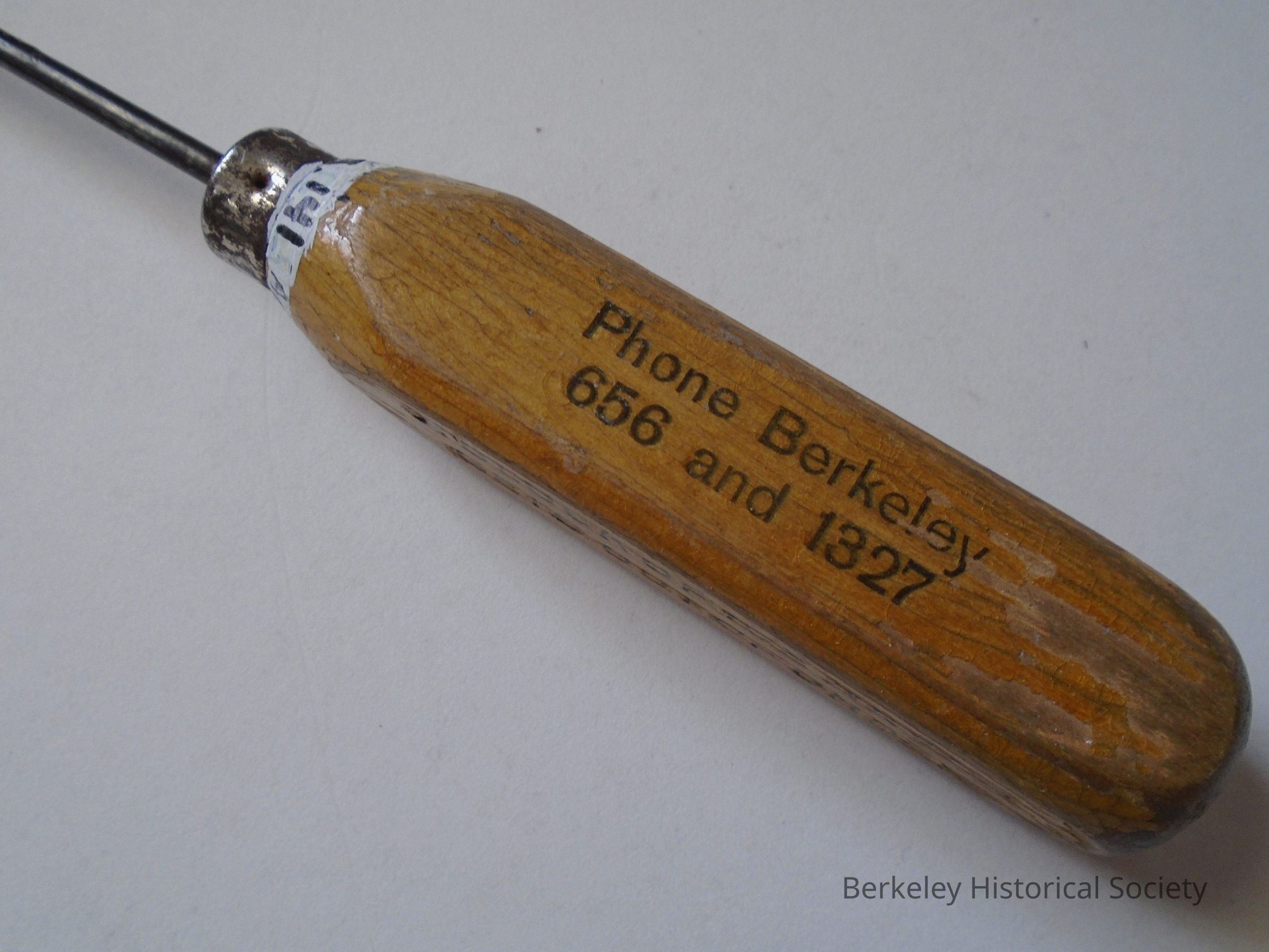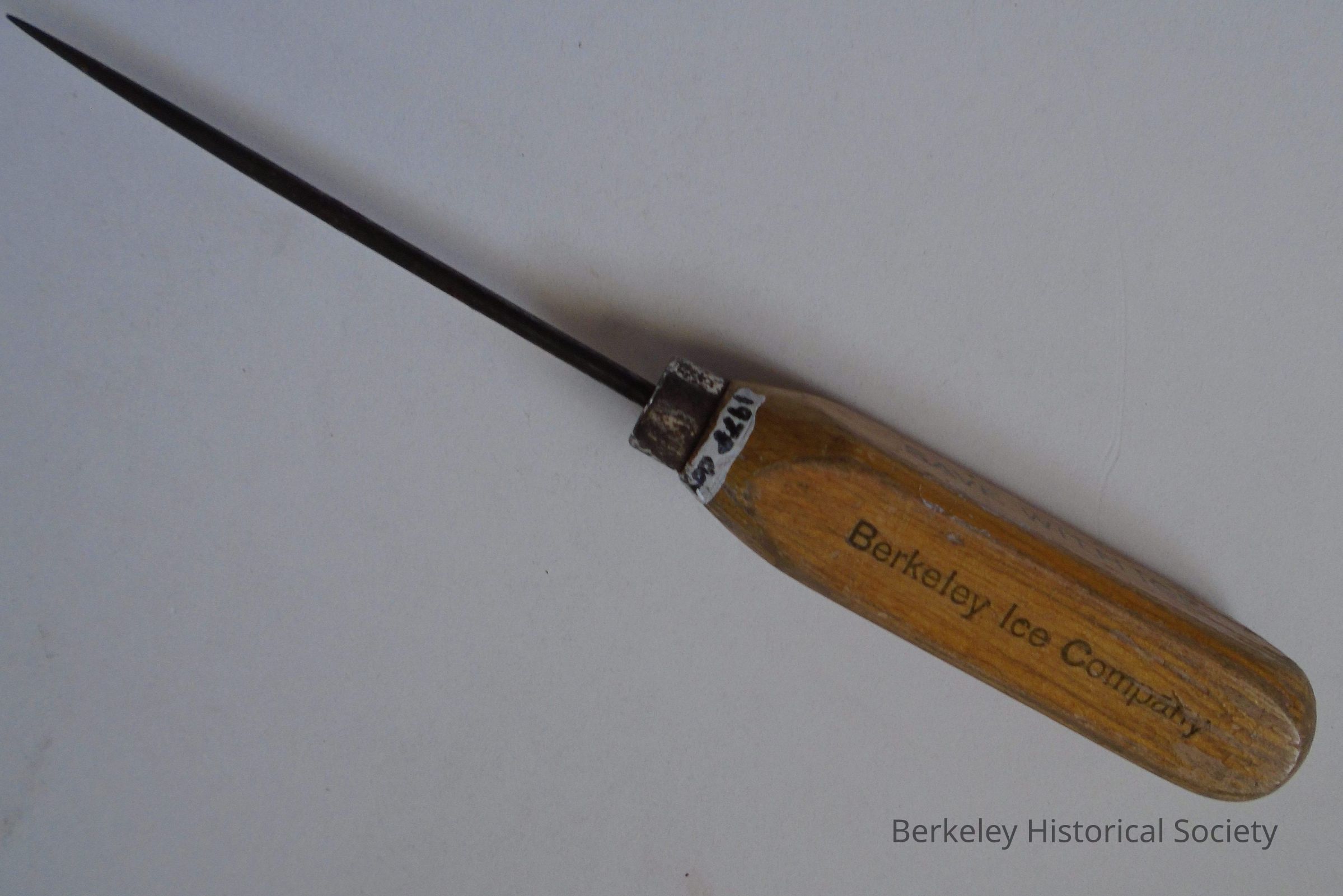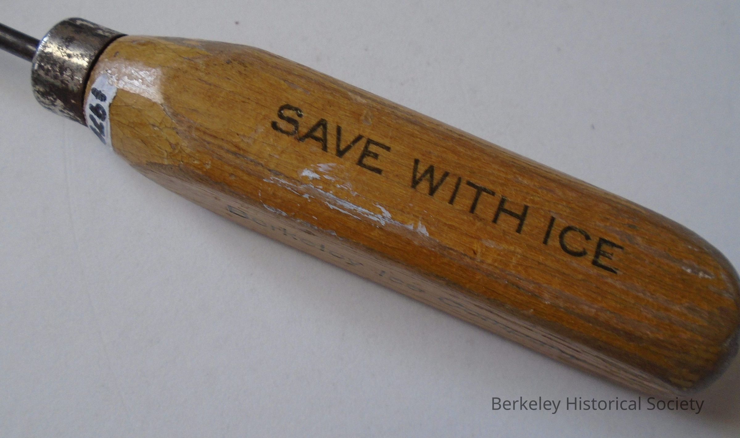 Wood handled ice pick. Handle is square and pick is metal spike attached to handle with metal grommet. Printed on sides of pick: "Berkeley Ice Company, Phone Berkeley 656 and 1327, A BLOCK OF ICE NEVER GETS OUT OF ORDER, SAVE WITH ICE". Advertising.