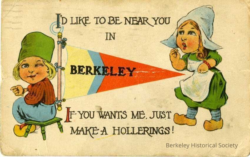 Divided postcard featuring color illustration of two Dutch people and the text "I'd like to be near you in Berkeley. If you wants me, just make a hollerings!" Message, stamp, and postmark present.