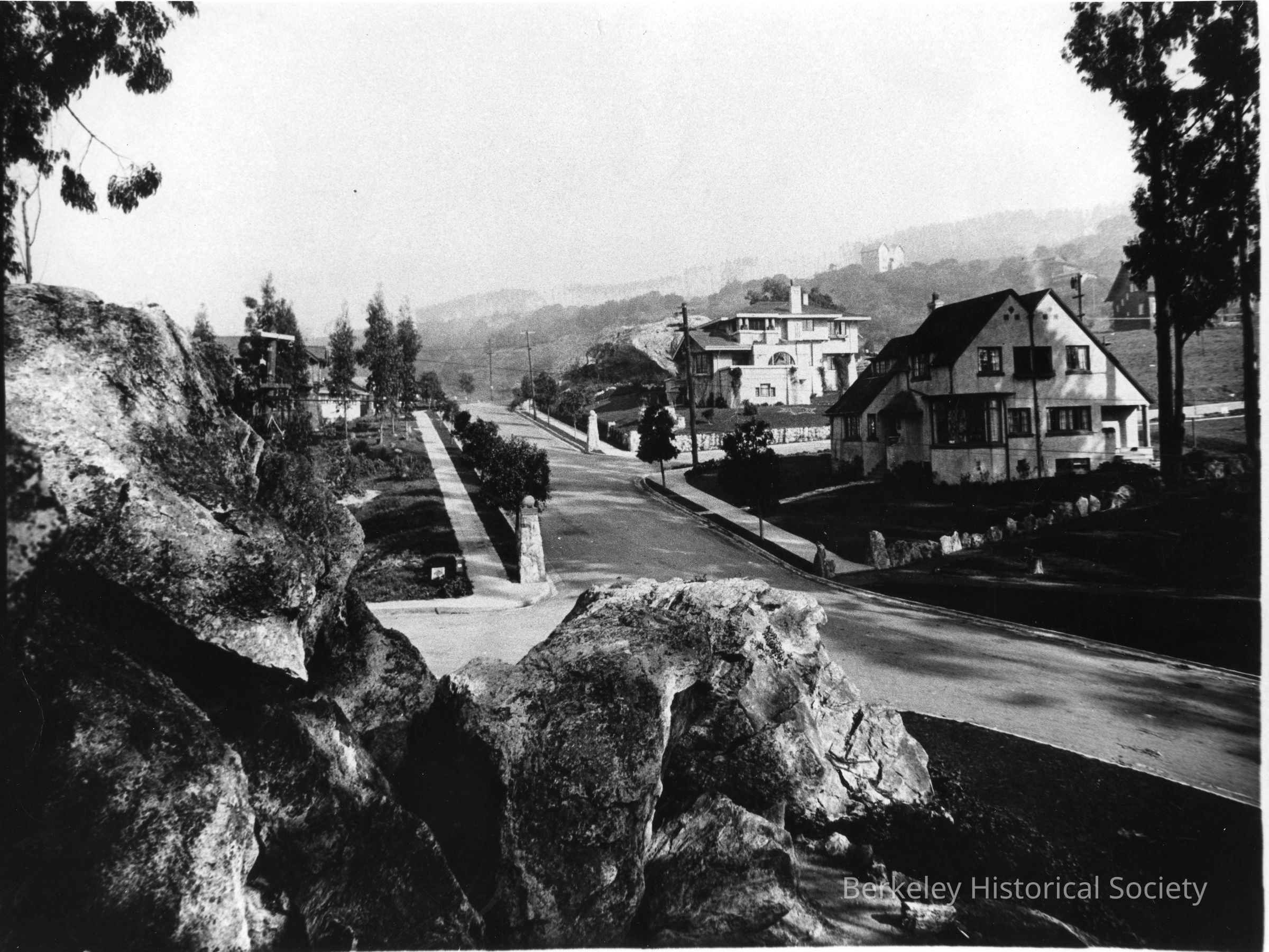 Rocks in foreground; two homes at Oxford Street and Indian Rock Avenue beyond.