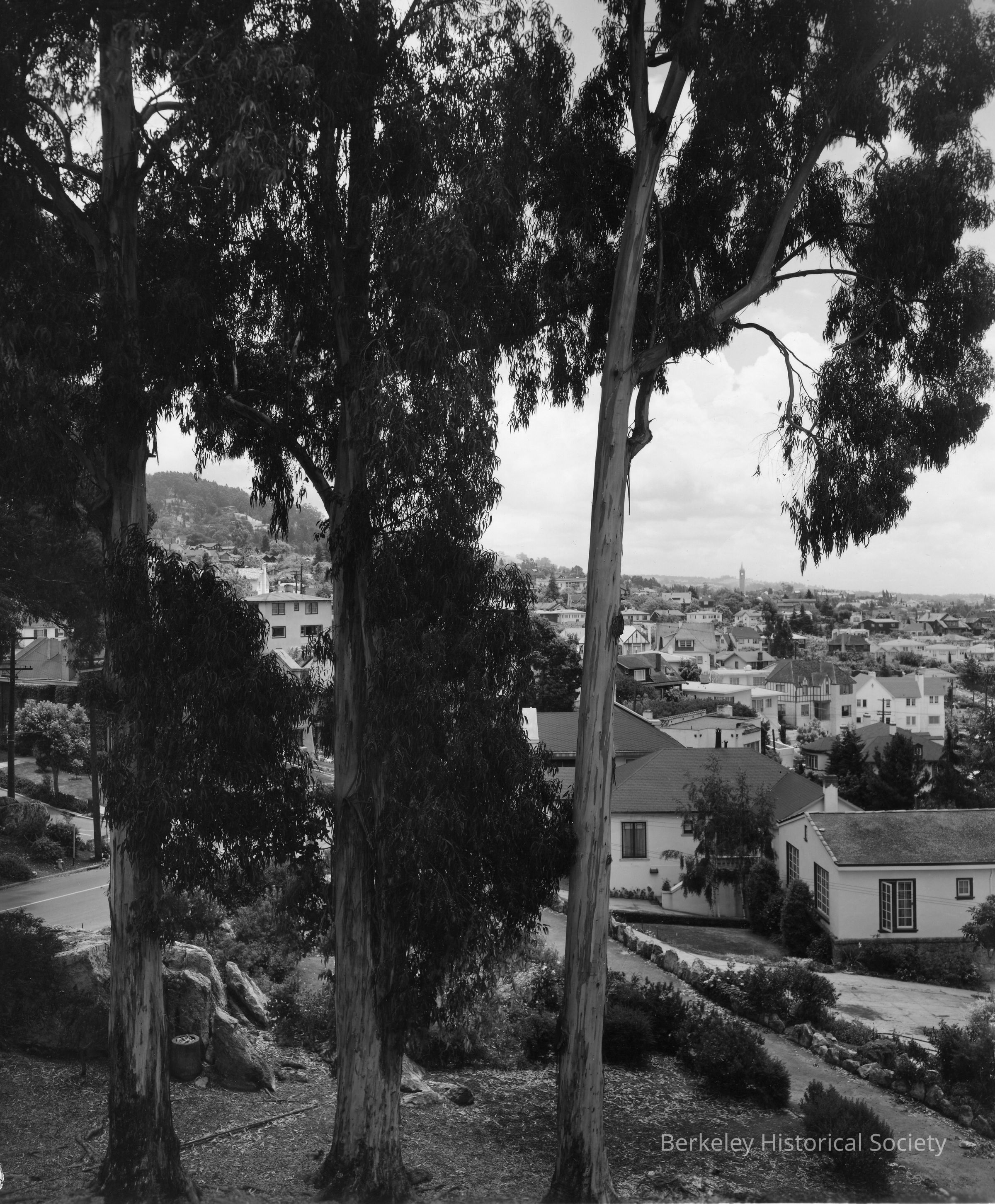 View to the south; eucalyptus trees in foreground, residential area beyond.