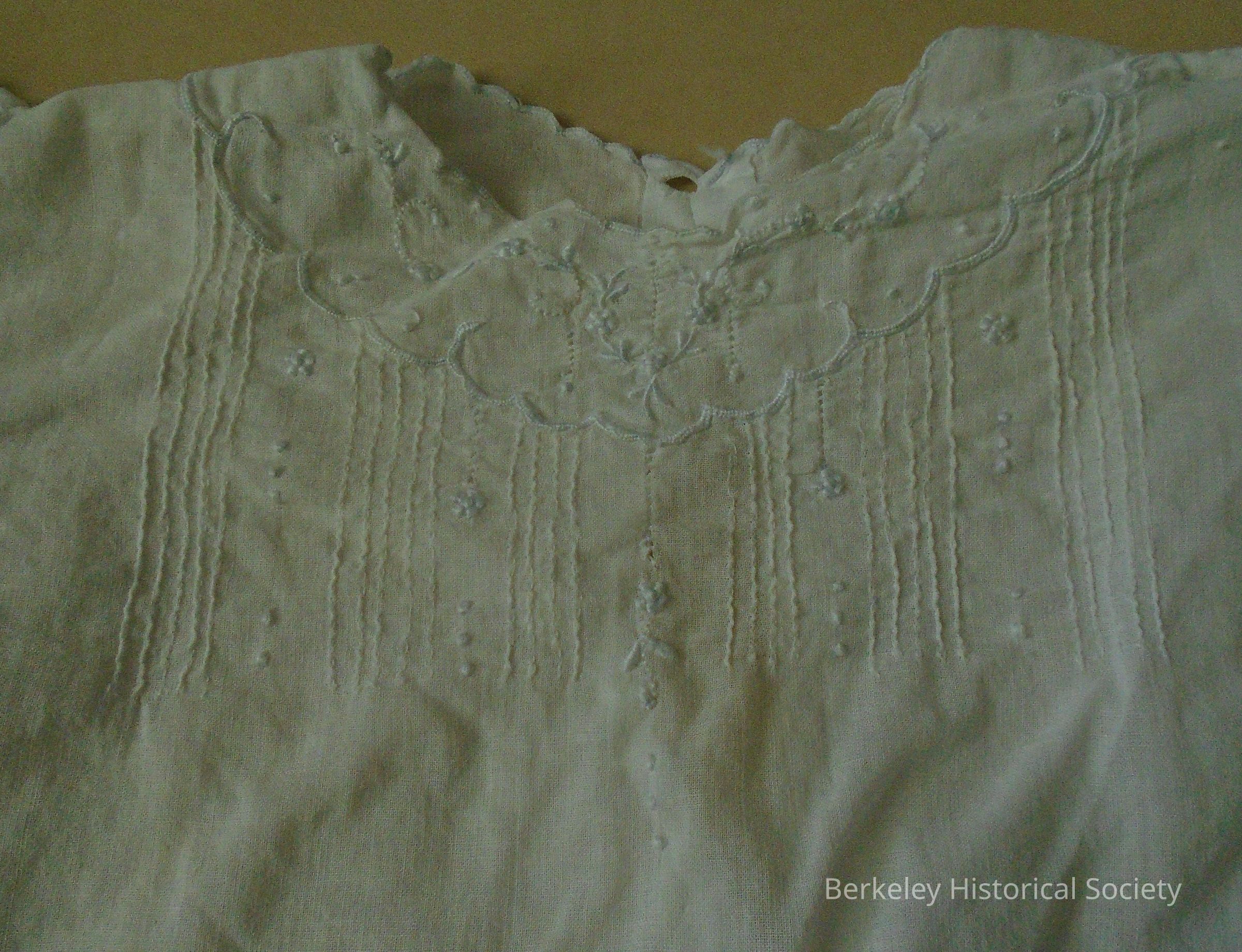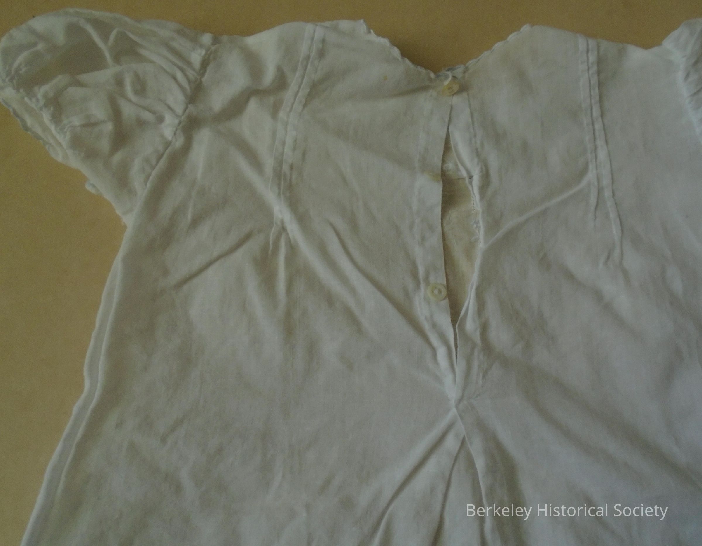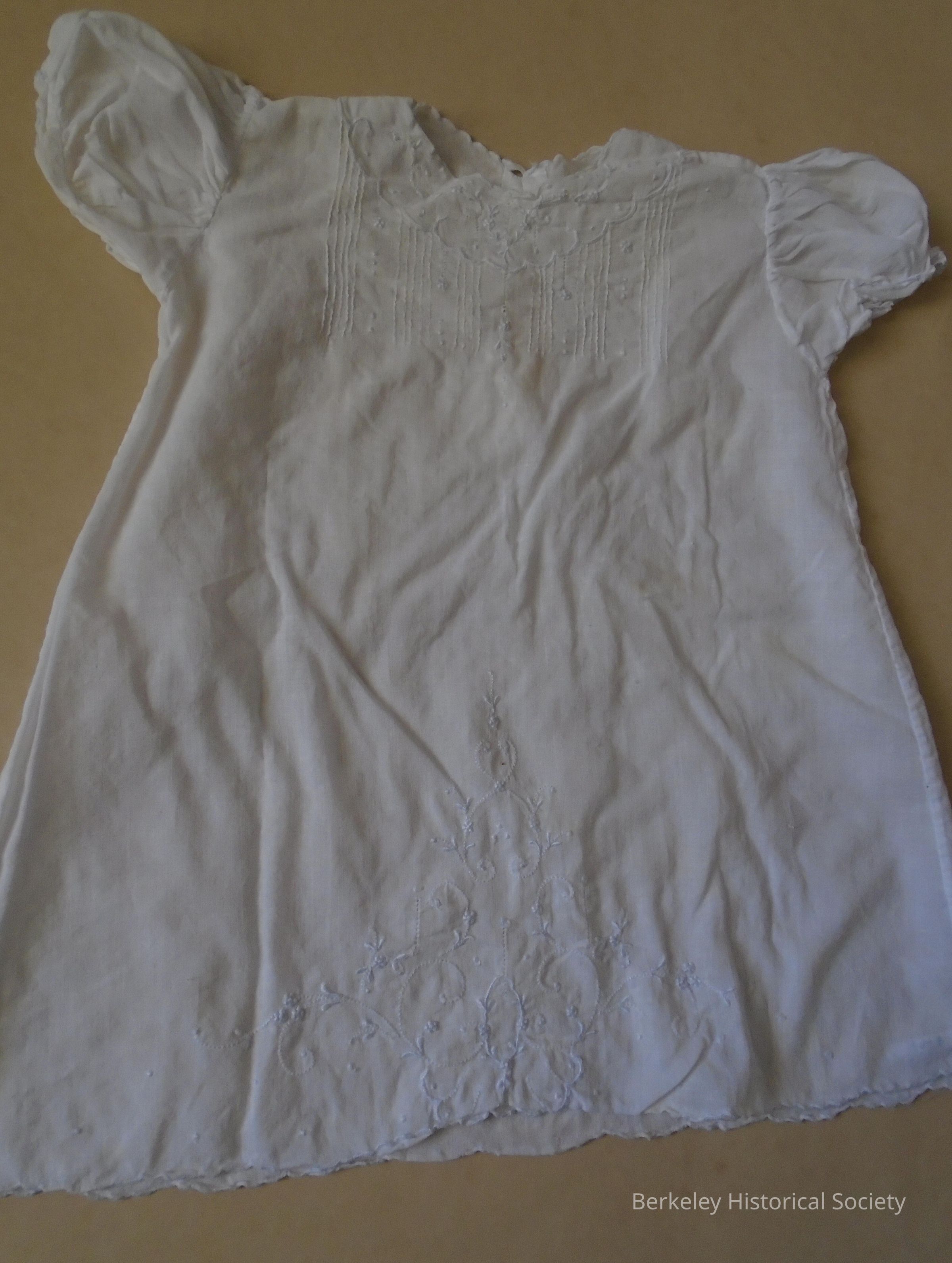 Infant dress. White, light cotton with embroidery in front, top and bottom. Short, puffy sleeve. Hand sewn with turned seams. Buttons and tucks in back. De Fremery family.