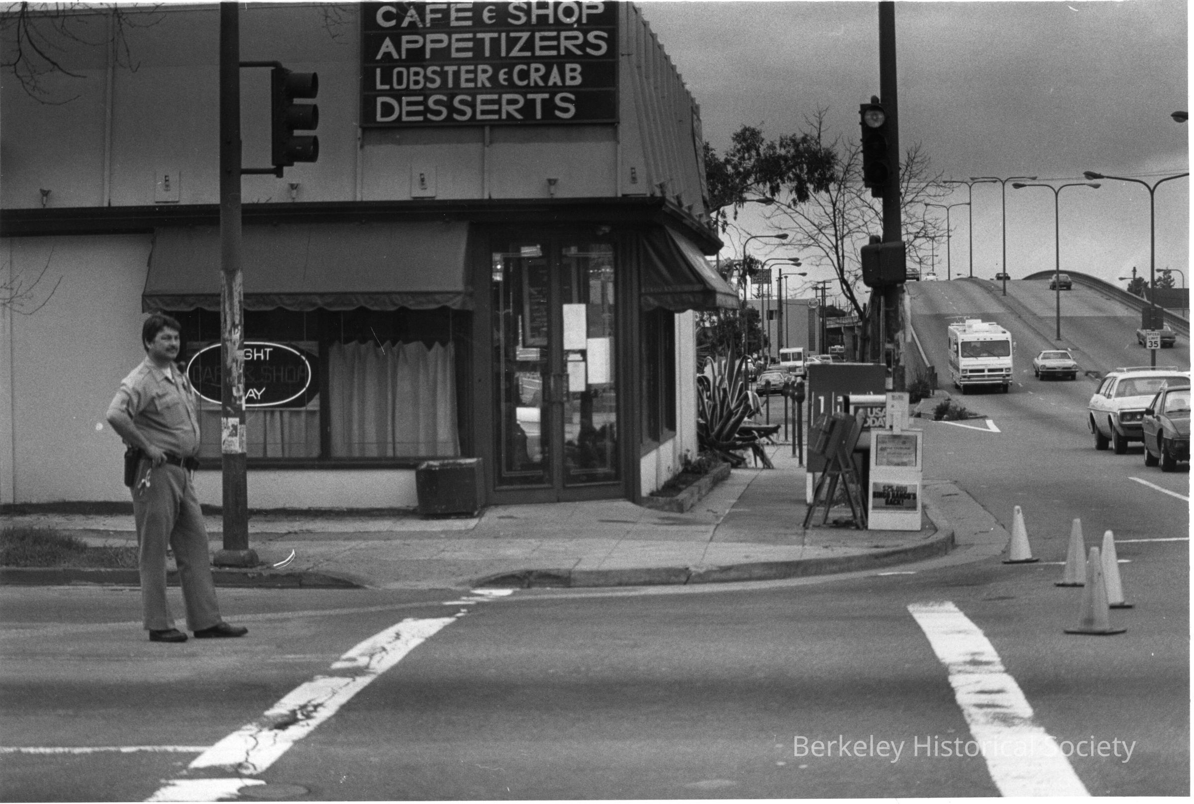 Restaurant on southwest corner, but name not visible. Policeman and cones in street. View to west with vehicles coming off overpass.