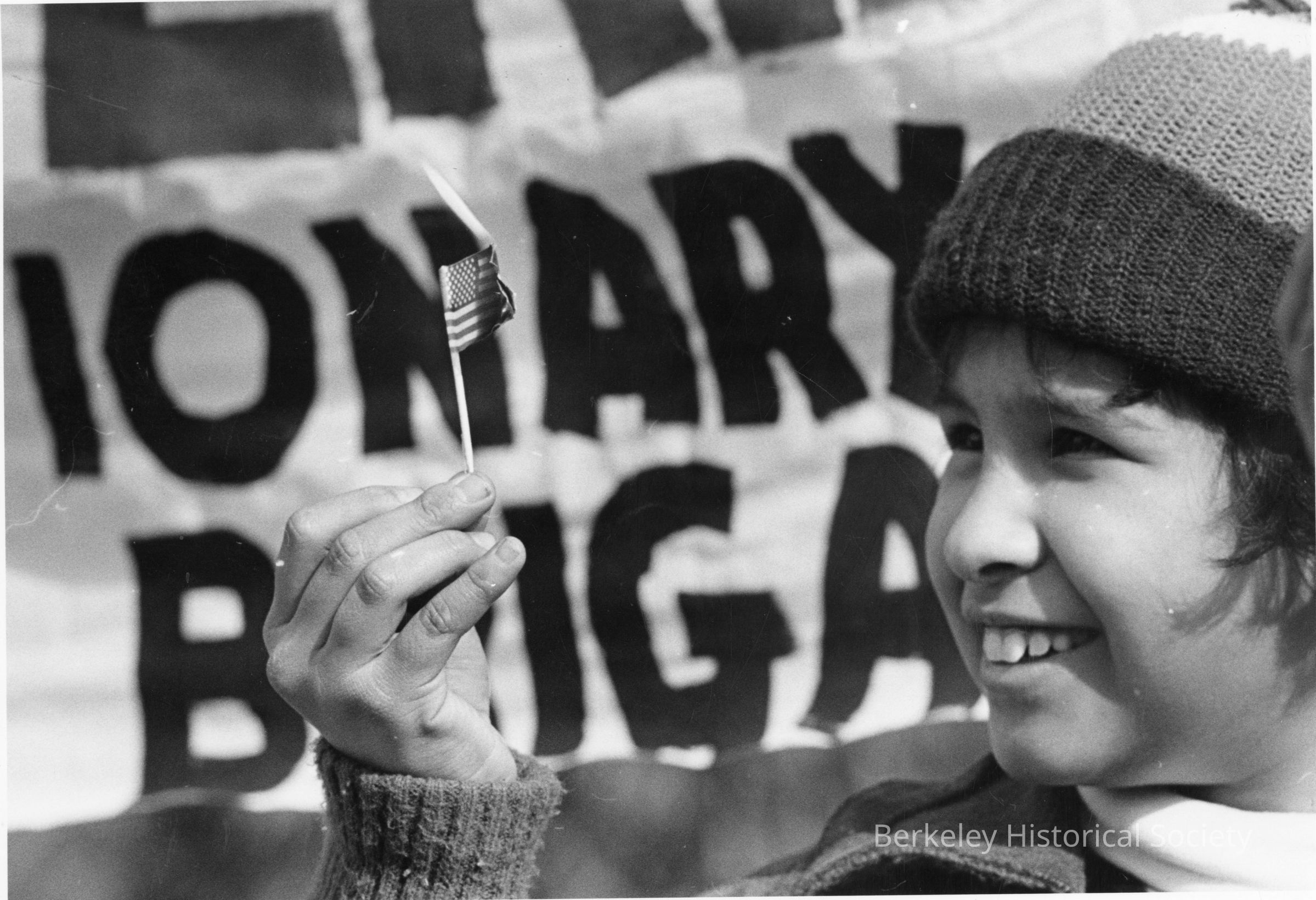 Close up of child holding small paper United States Flag; portion of banner in background. Photo taken on university campus.