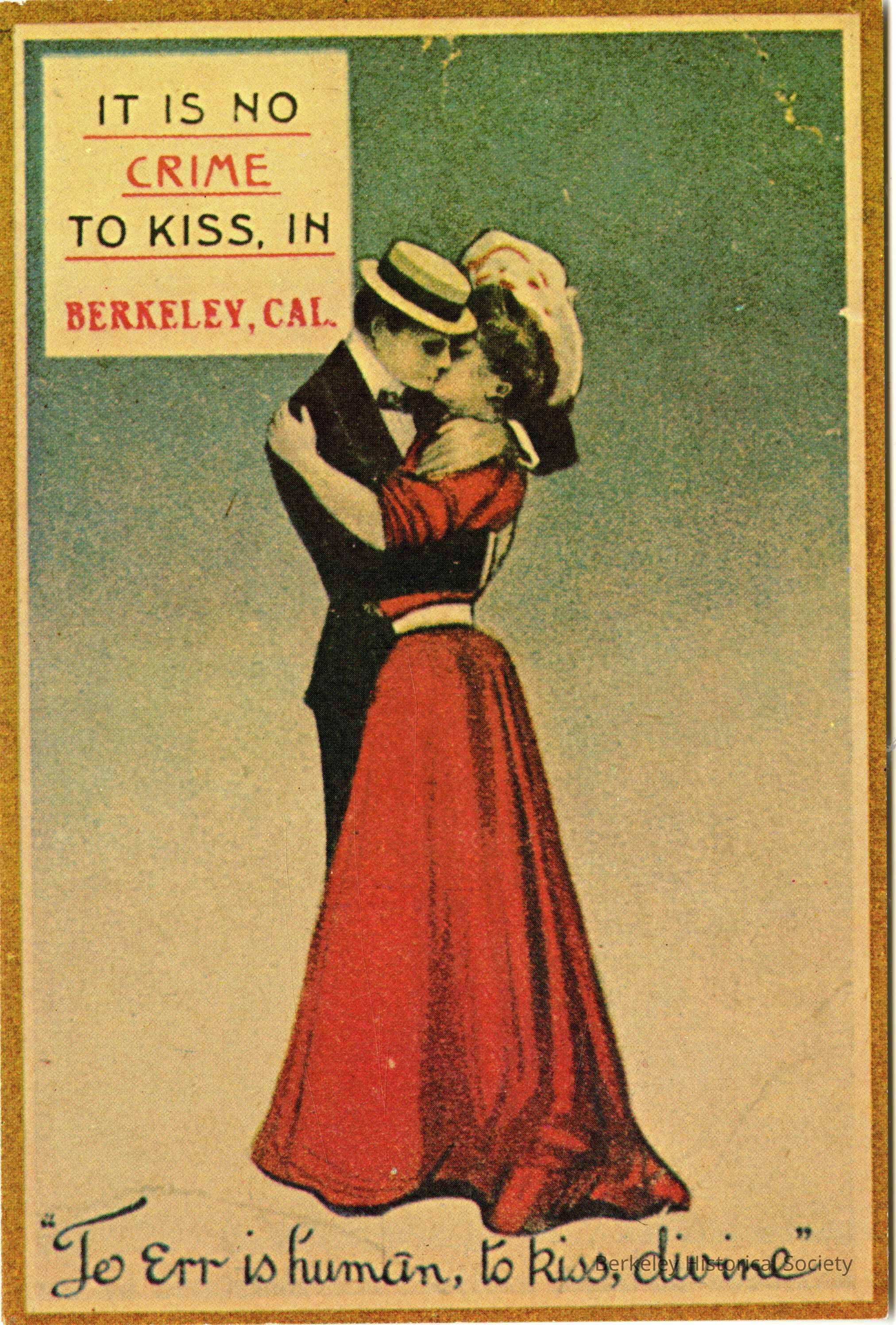 Postcard featuring color reproduction of an image of a couple cissing with the text "It Is No Crime to Kiss In Berkeley, CAL." and "To Err is human, to kiss, divine." Note from the "Berkeley Post Cards" binder indicates that the reproduced image is from an popular 1890's postcard.
