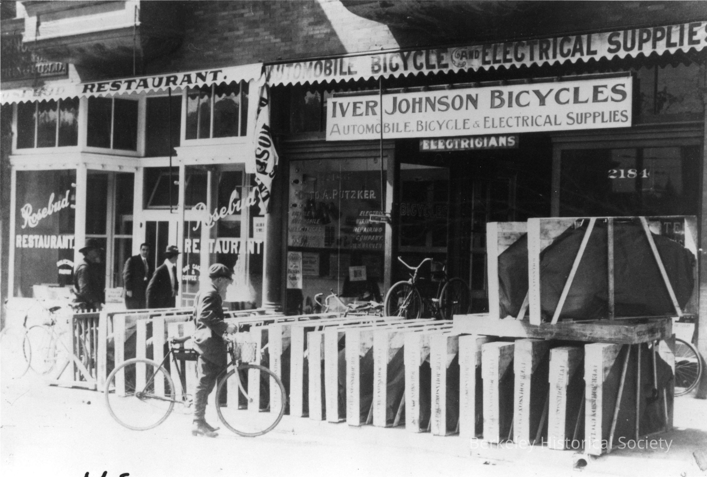 Storefront at 2184 Shattuck Avenue, sign says "Automobile, bicycle & Electrical Supplies." To the left is Rosebud Restaurant.