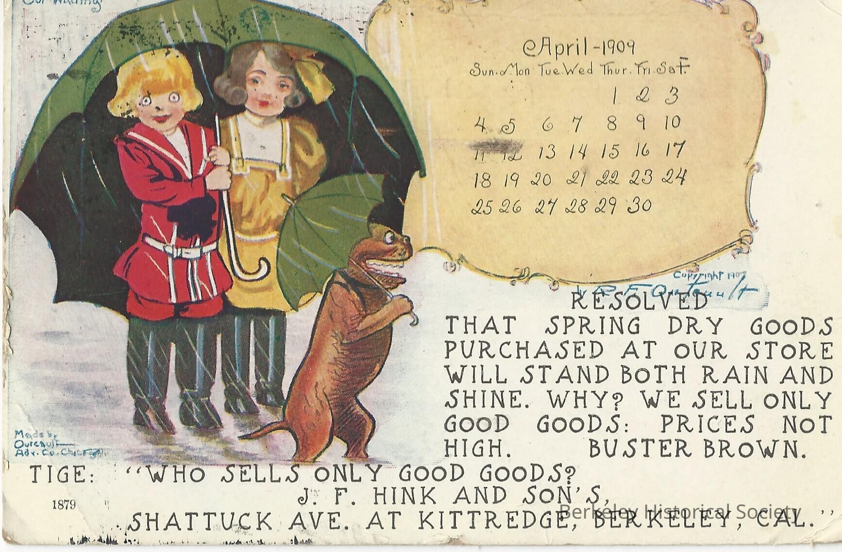 Printed messages, front and back, with calendar for April 1909. Postmarked April 1, 1909.