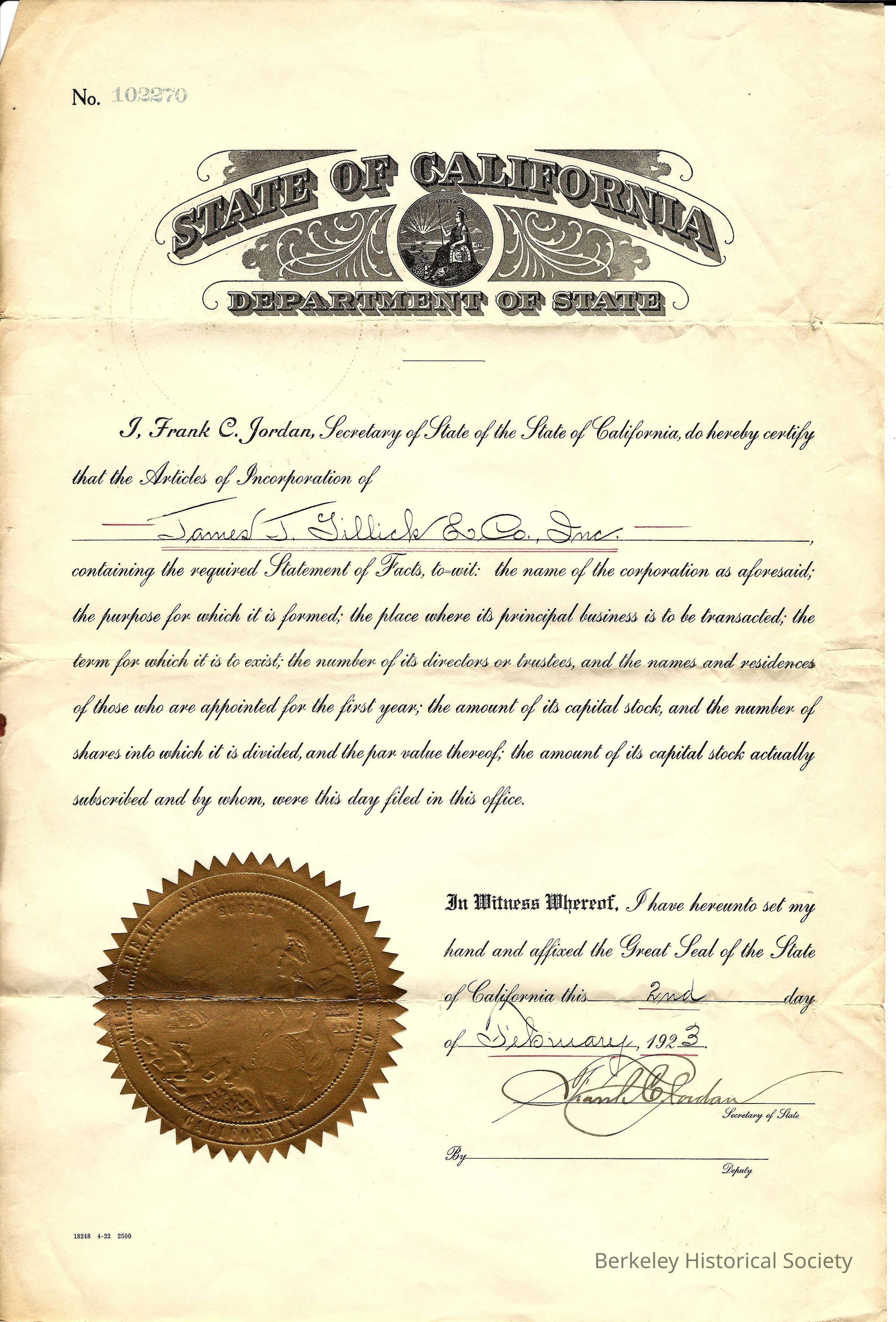 Box includes certificate of articles of incorporation by California Dept of State, 1923; tax forms for 1928 and 1929; Berkeley Gazette, 3/6/1967 with photo of Martin Robertson, vice president; Berkeley Gazette, 10/31/1968 "'68 Progress Report" section, with Gillick advertisement.