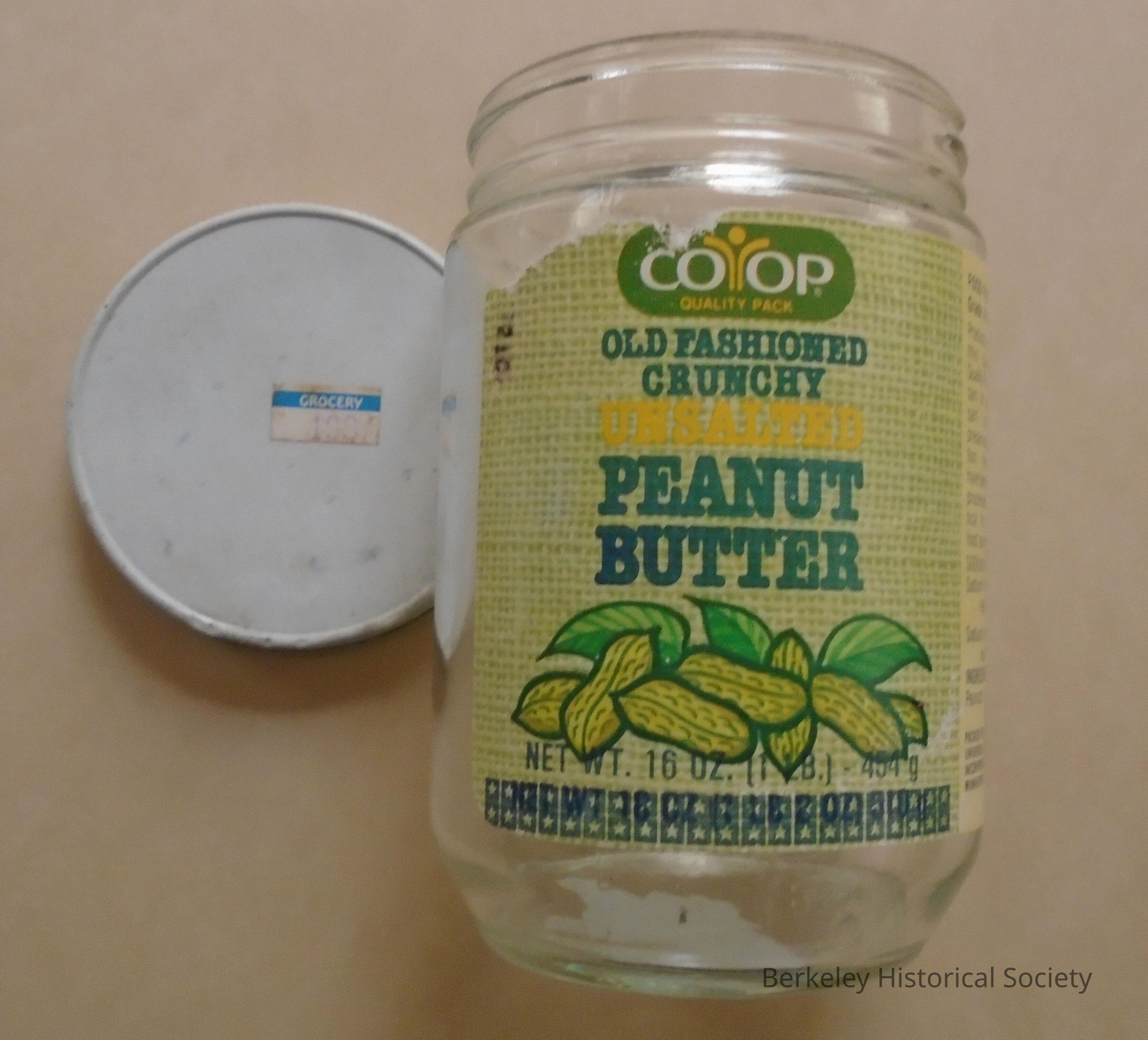 Glass jar with metal screw lid. Paper label : CO-OP Peanut butter, old fashioned crunchy unsalted, 16 oz., green and yellow with picture of peanuts. Lid has price of 199 cents.