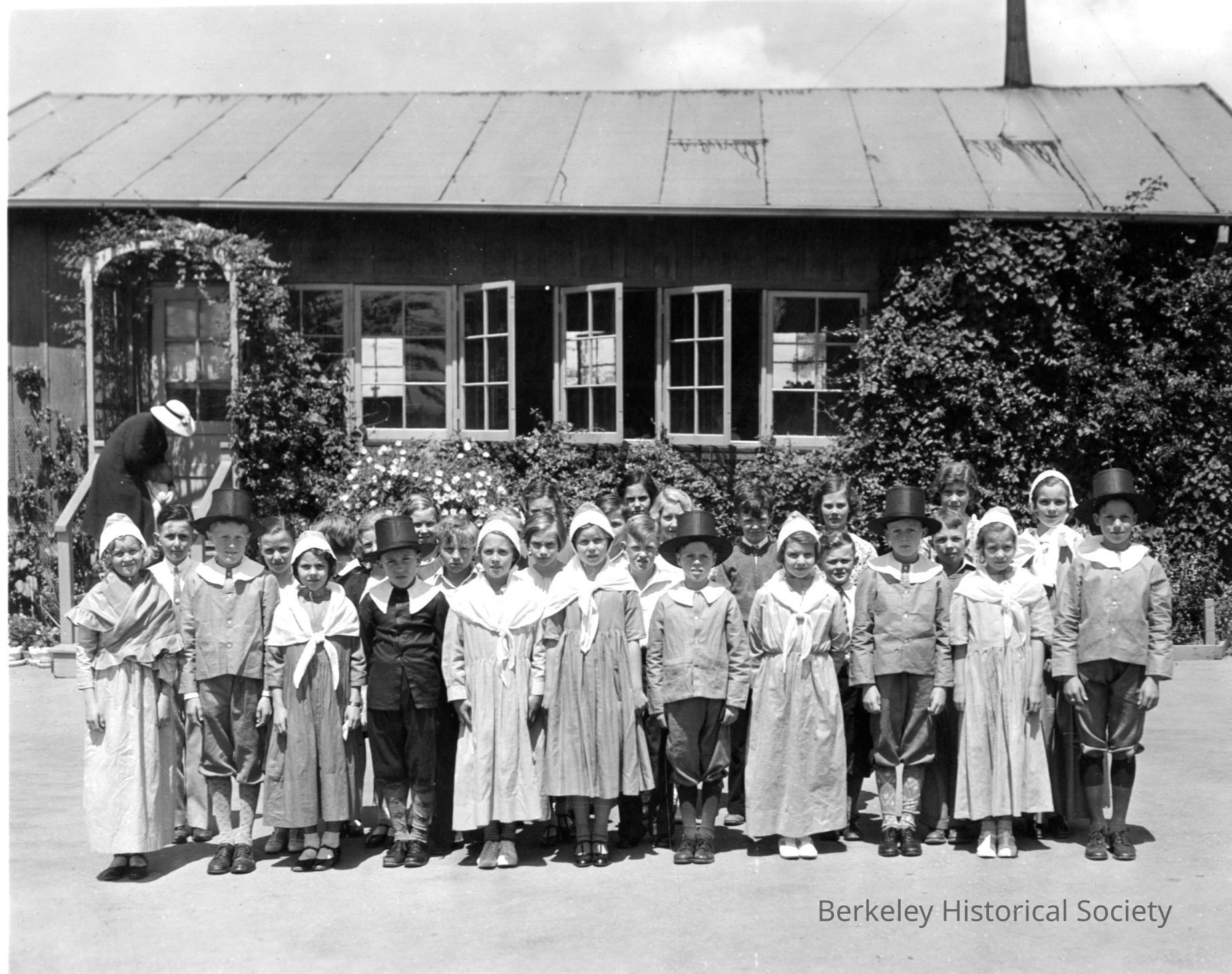 Students in pilgrim costume standing in front of building.Other Names and Numbers