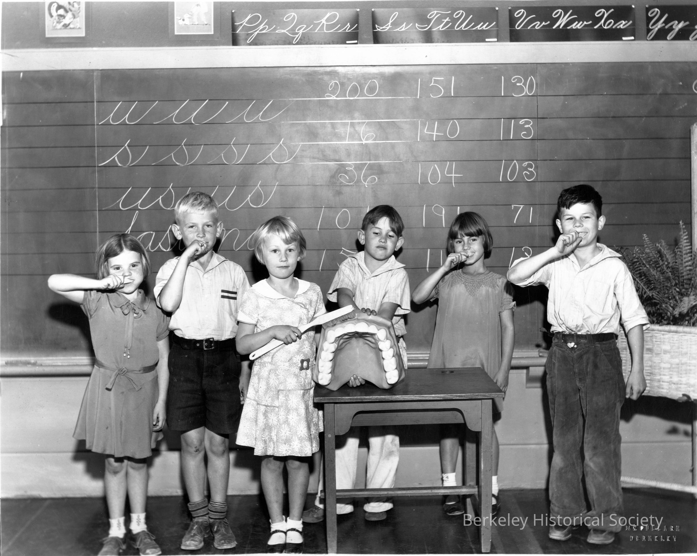 Toothbrush drill; children in front of blackboard with penmanship samplesOther Names and Numbers