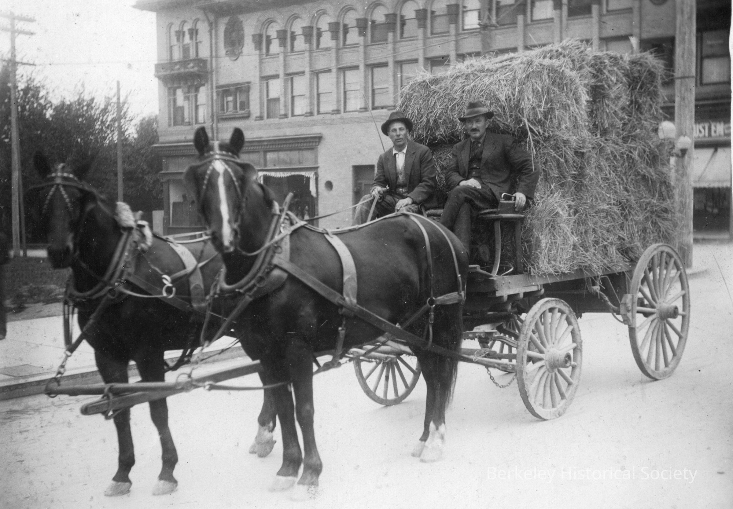 Horse-drawn hay cart with two men in front of Barker Building, Shattuck and Dwight